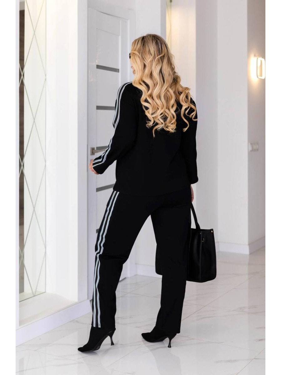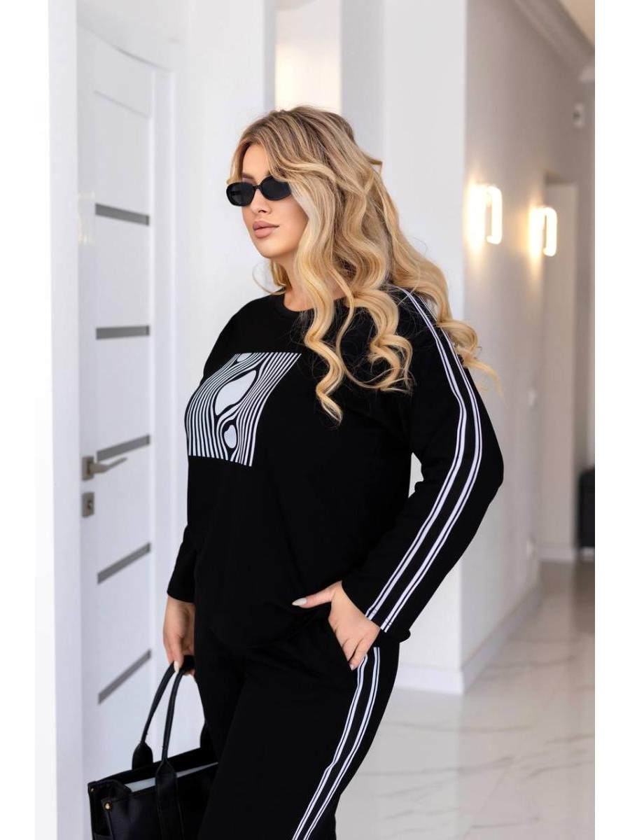 ▫️Верх костюма — світшот з якісної двонитки, прикрашений графічним малюнком у вигляді чорно-білих ліній. З боків рукавів лампаси. Низ костюма – вільні штани з аналогічними лампасами та кишенями з боків. Стиль костюма повсякденний, що підходить як для активного відпочинку, так і для прогулянок. Принт на грудях додає оригінальності, виділяючи костюм серед звичайних спортивних комплектів, робить силует витонченим. Також біла смужка на рукавах і штанах гармонійно доповнює загальний дизайн, додаючи динамічності і стилю.