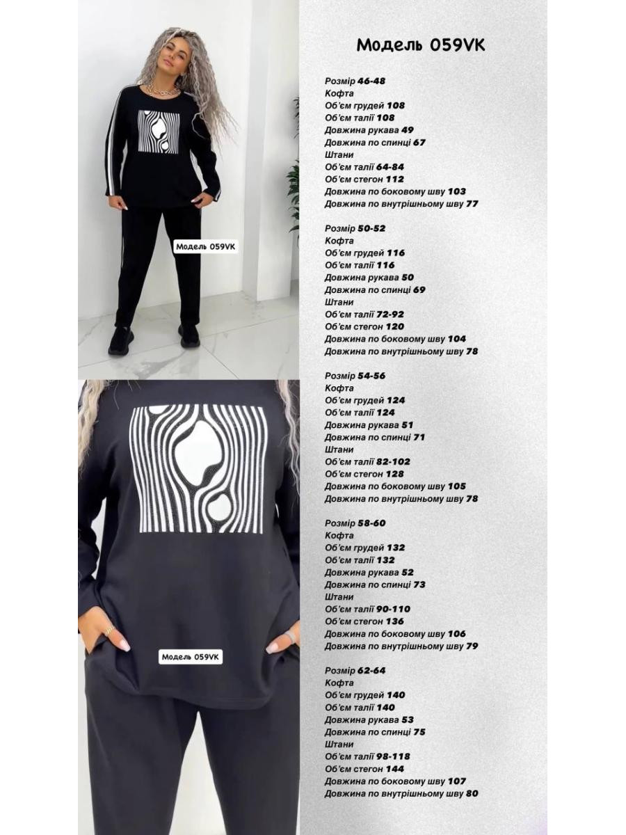 Розмір 54-56 Кофта Обʼєм грудей 124 Обʼєм талії 124 Довжина рукава 51 Довжина по спинці 71 Штани Обʼєм талії 82-102 Обʼєм стегон 128 Довжина по боковому шву 105 Довжина по внутрішньому шву 78