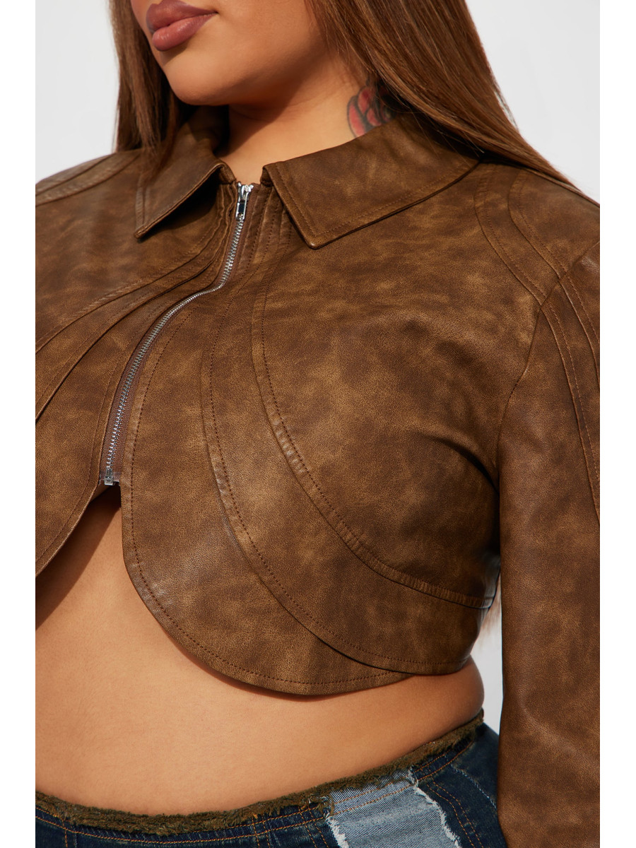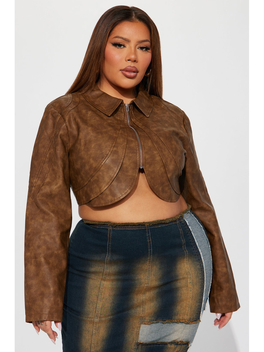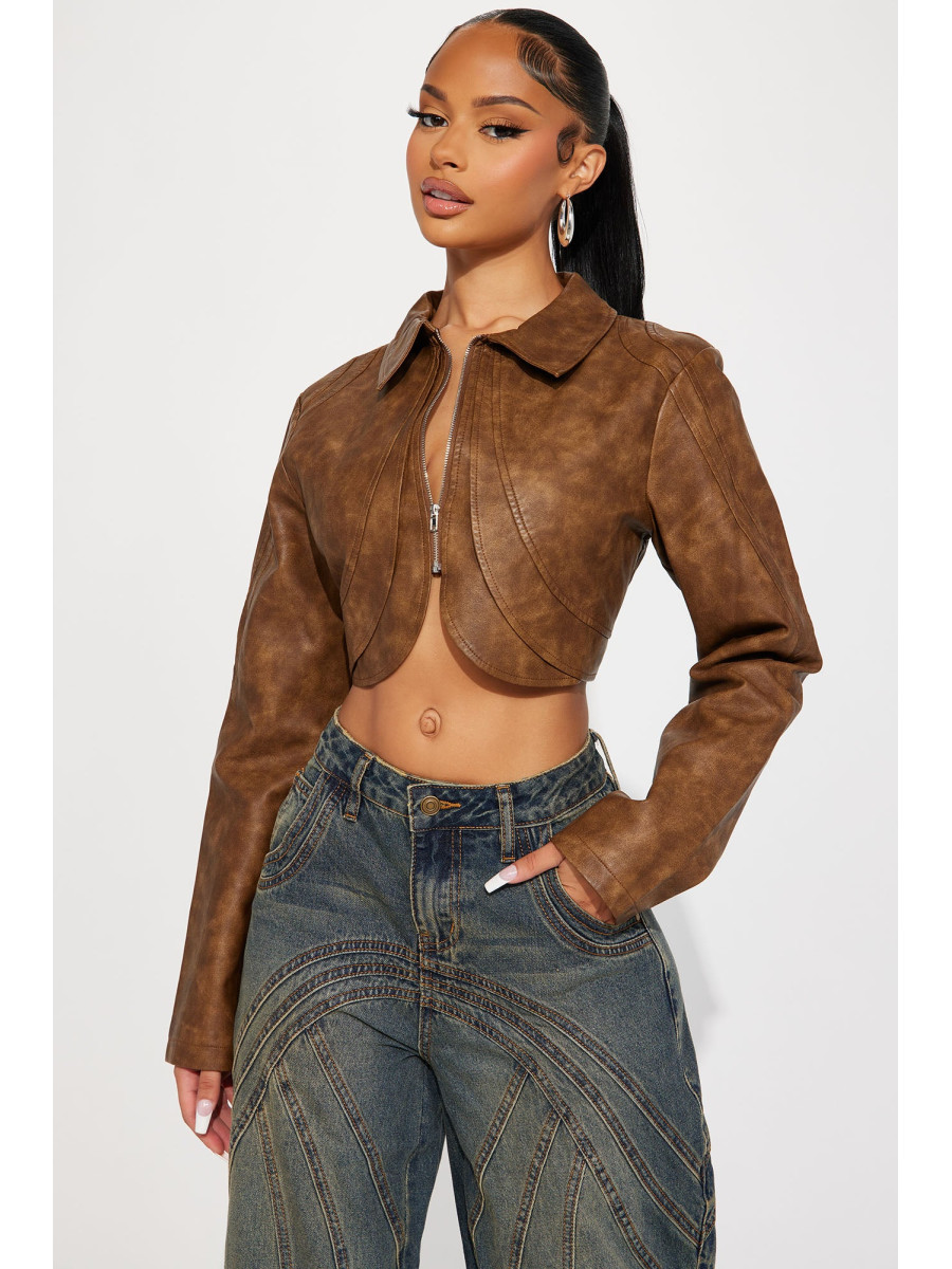 Ефектний топ зі штучної шкіри з довгими рукавами, коміром та передньою застібкою-блискавкою. Ця коротка модель з підкладкою та унікальним ефектом потертості, який робить кожен виріб неповторним. Склад: основа - 50% поліуретан, 50% віскоза; підкладка - 95% поліестер, 5% спандекс.