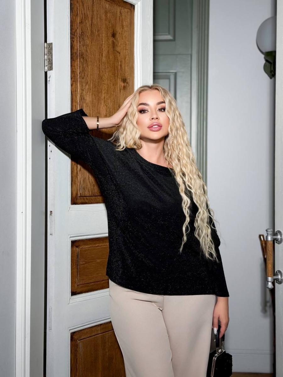 МОДЕЛЬ ‼️ Базовий люрексовий лонгслів з вільного крою довжиною рукава 7/8 приспущений плечовий шов . Горловина човником. Розрізи по боках. ▪️РОЗМІРИ ПОДВІЙНІ 1)46-48 2)50-52 3)54-56
