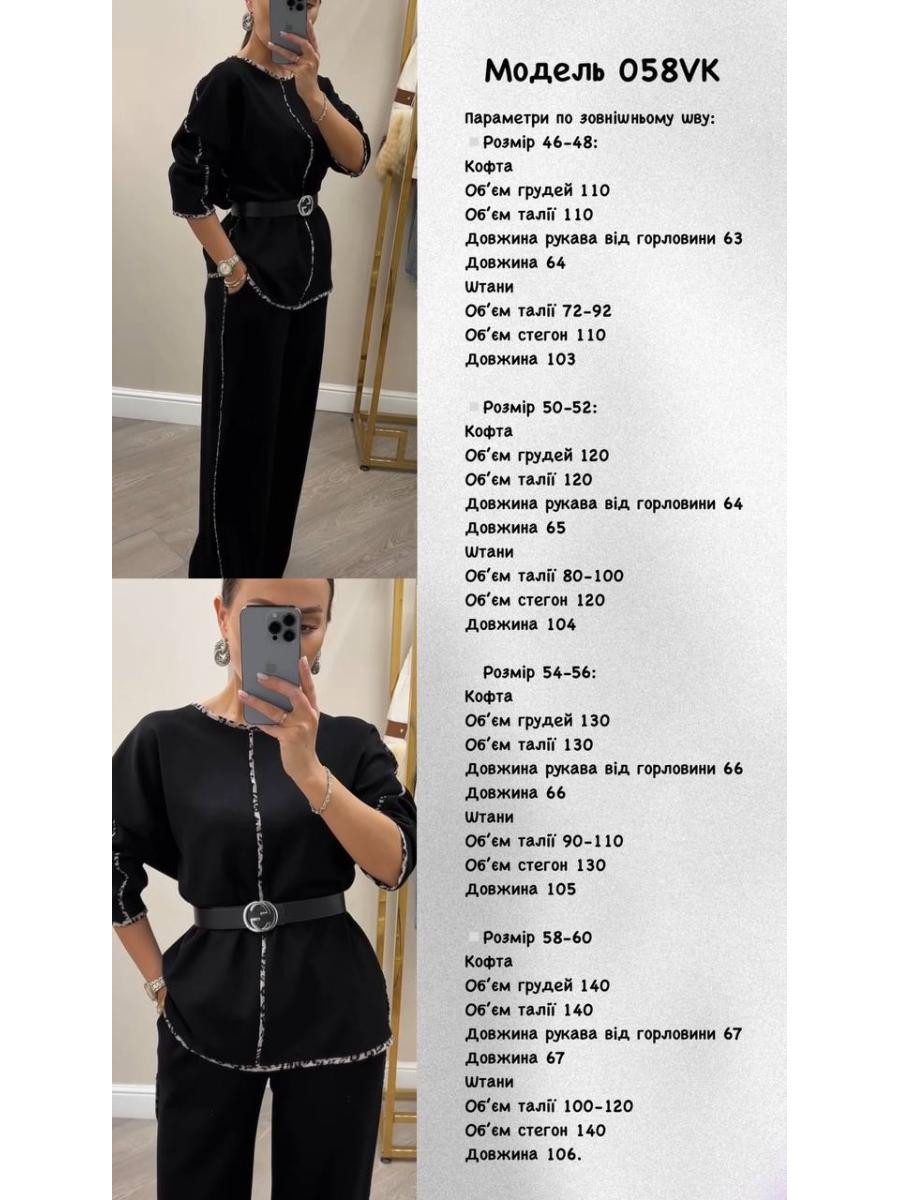 Розмір 54-56: Кофта Об’єм грудей 130 Обʼєм талії 130 Довжина рукава від горловини 66 Довжина 66 Штани Обʼєм талії 90-110 Обʼєм стегон 130 Довжина 105