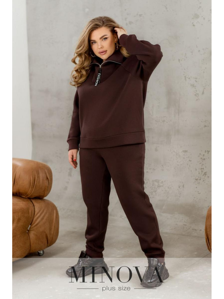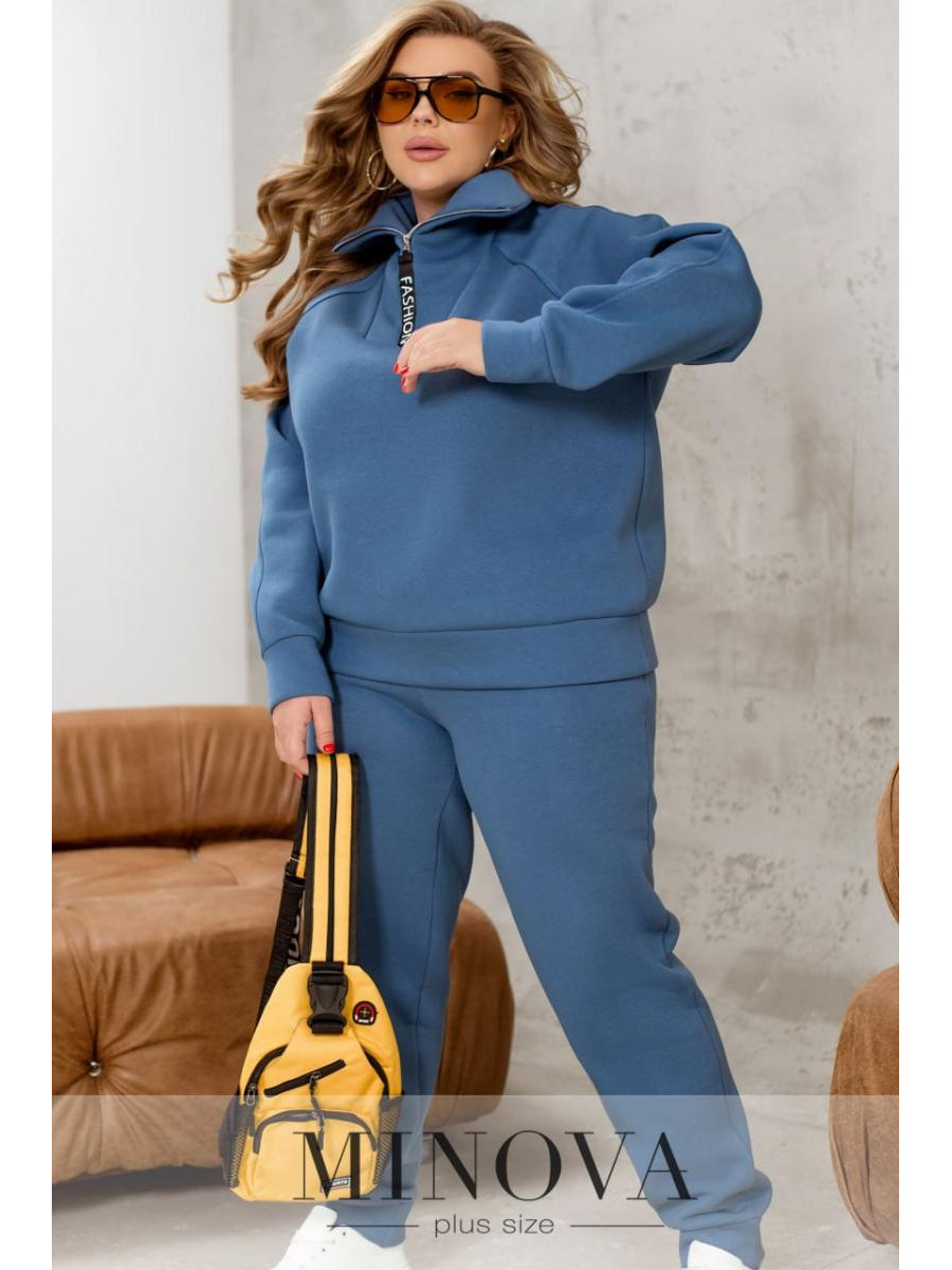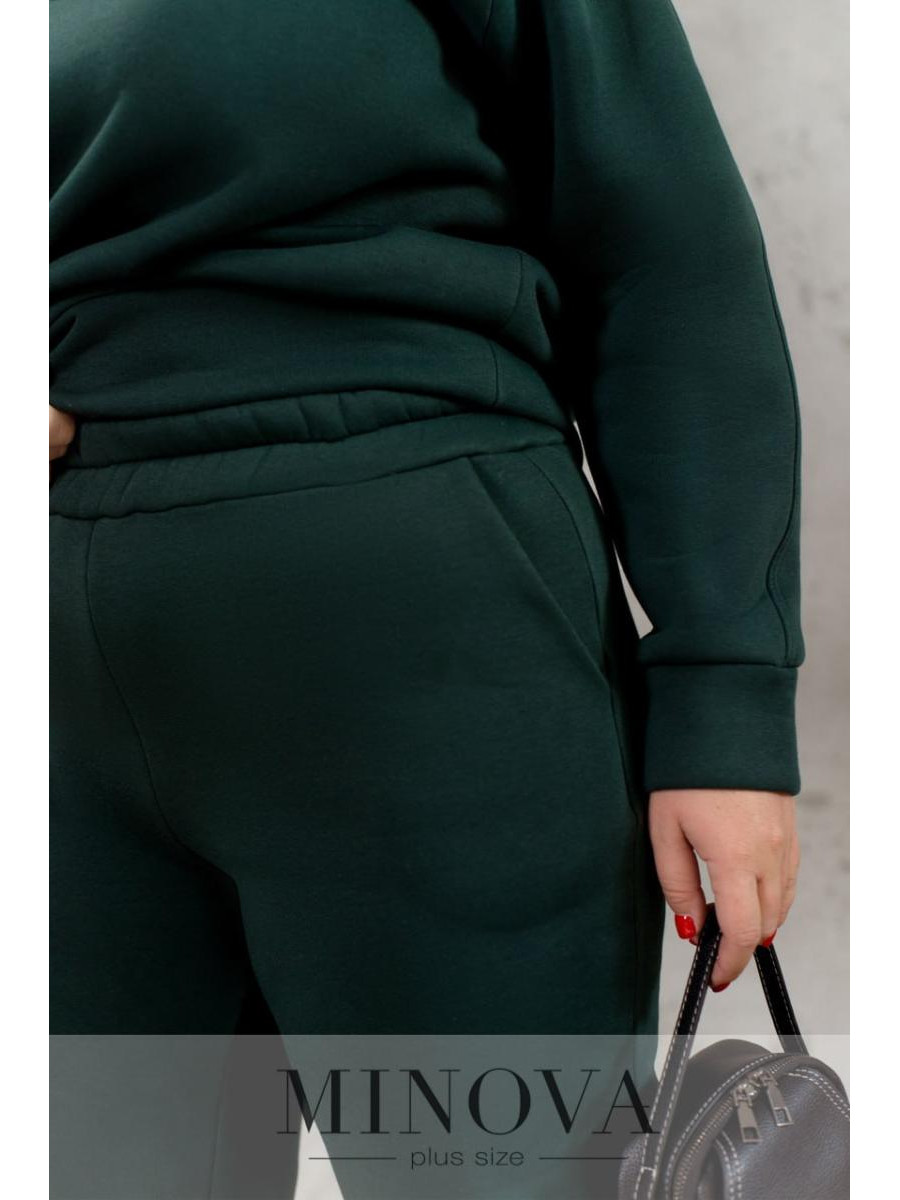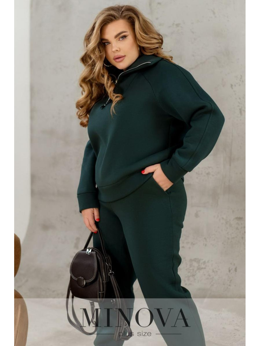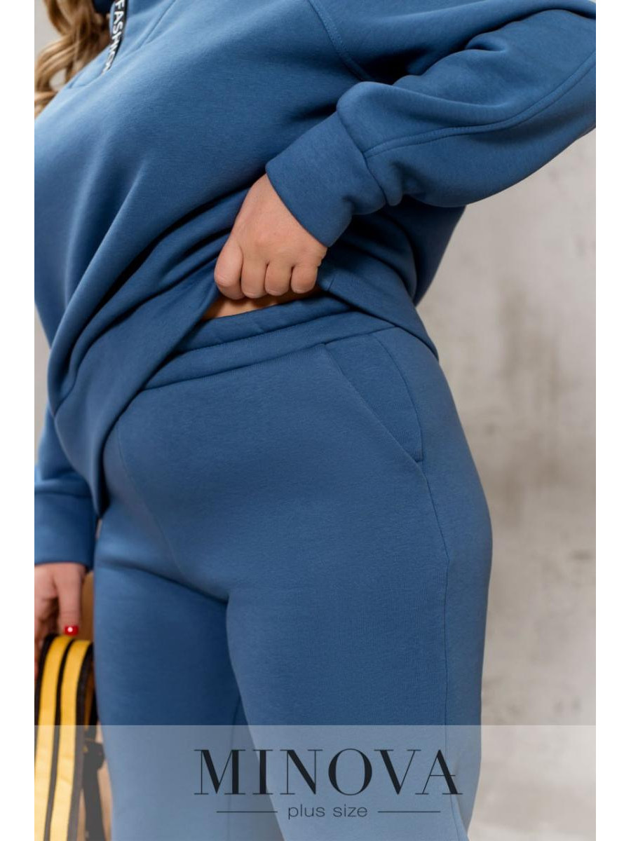 Спортивний костюм із трьохнитки на флісі, забезпечує ідеальне поєднання тепла та комфорту в прохолодну погоду. Худі має зручну змійку і високу горловину, що ефективно захищає шию від холоду. Довгі рукави з манжетами забезпечують комфортну посадку та зберігають тепло. Штани з високою посадкою на еластичній гумці підкреслюють фігуру та забезпечують максимальну свободу рухів. Манжети внизу штанів додають стильного вигляду та додаткового тепла. Бокові кишені роблять костюм практичним і зручним для щоденного носіння або активного відпочинку. На моделі представлений розмір 50-52