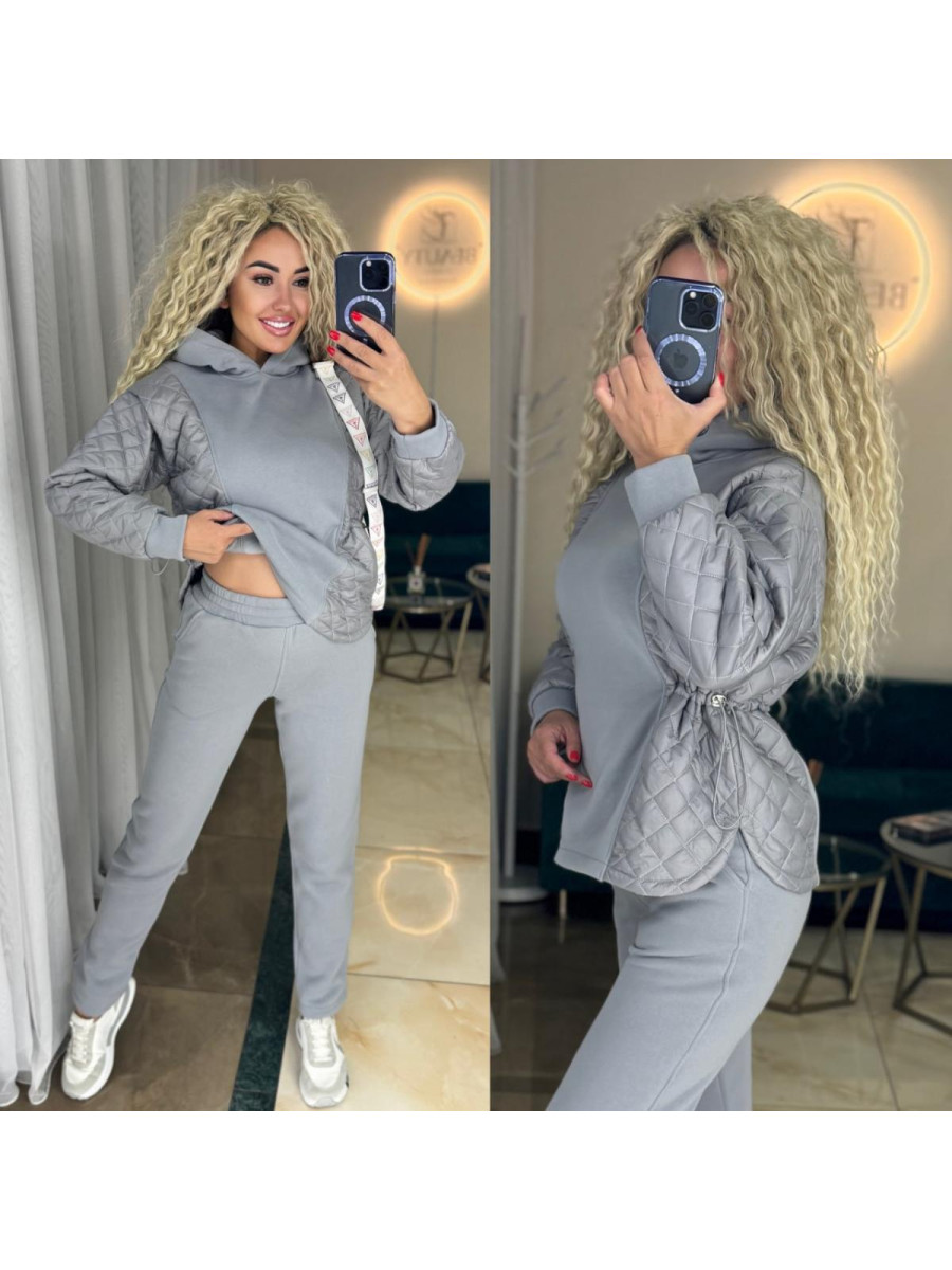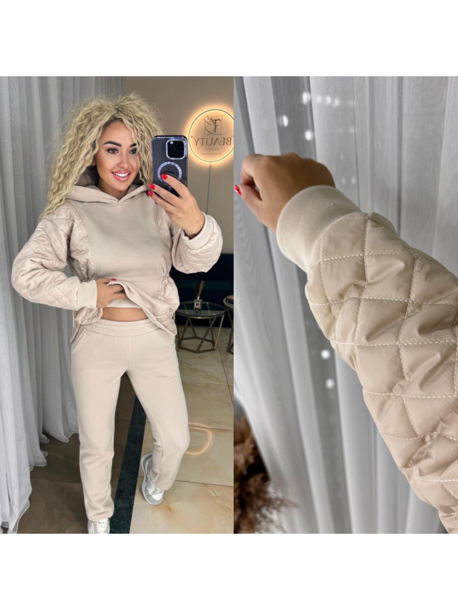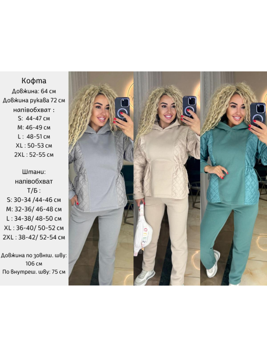 Розміри: S, М, L, XL, 2XL Тканина: тринитка гарної якості ,плащівка+100 силікон Опис: Затишний та теплий спортивний костюм із трикотажу на флісі та стьобаної плащівки. Комфортний крій, кофта на кулісці( в середині підклад) з капюшоном.Штани прямі з кишенями. (Заміри вказані на параметри)
