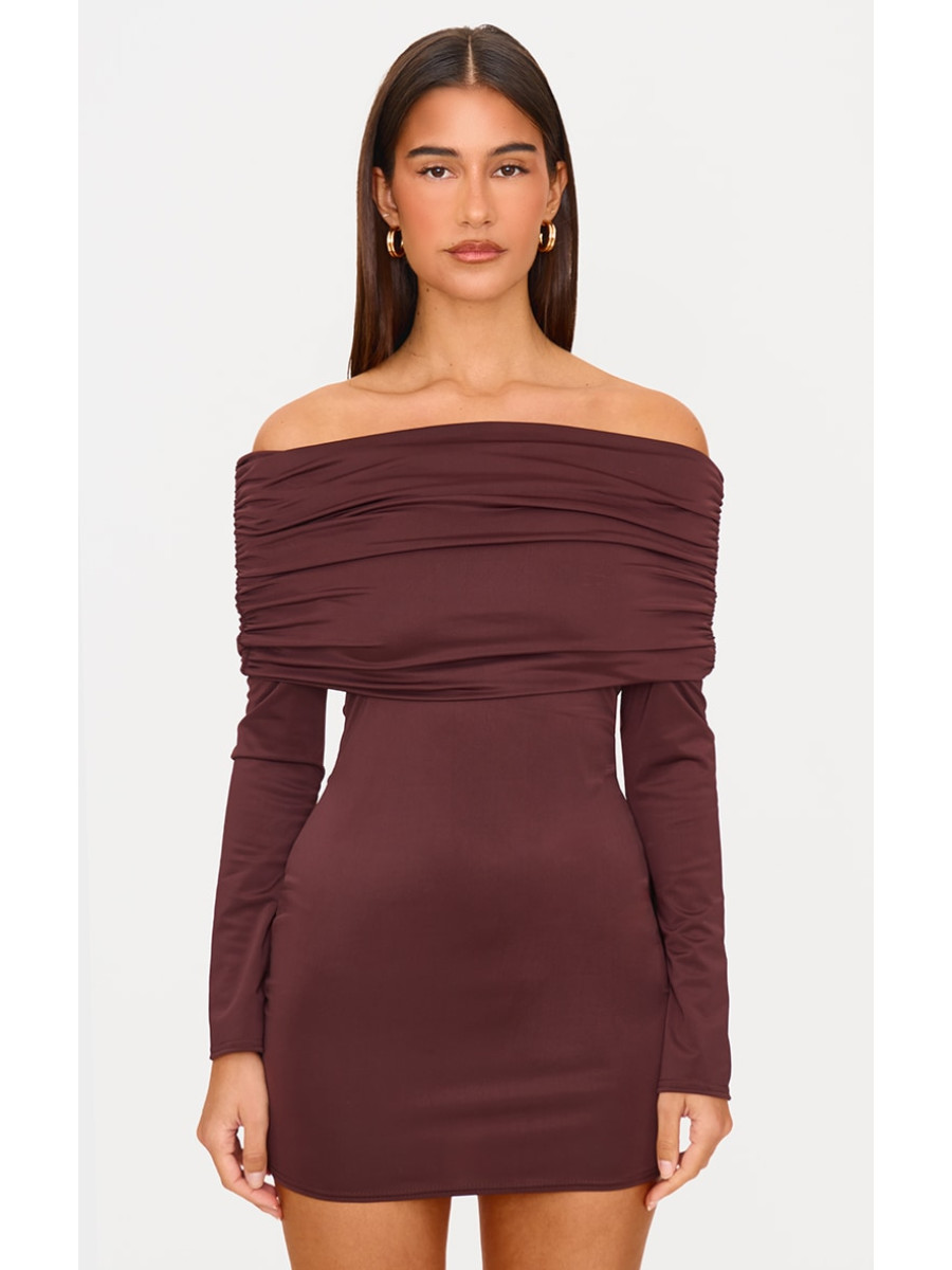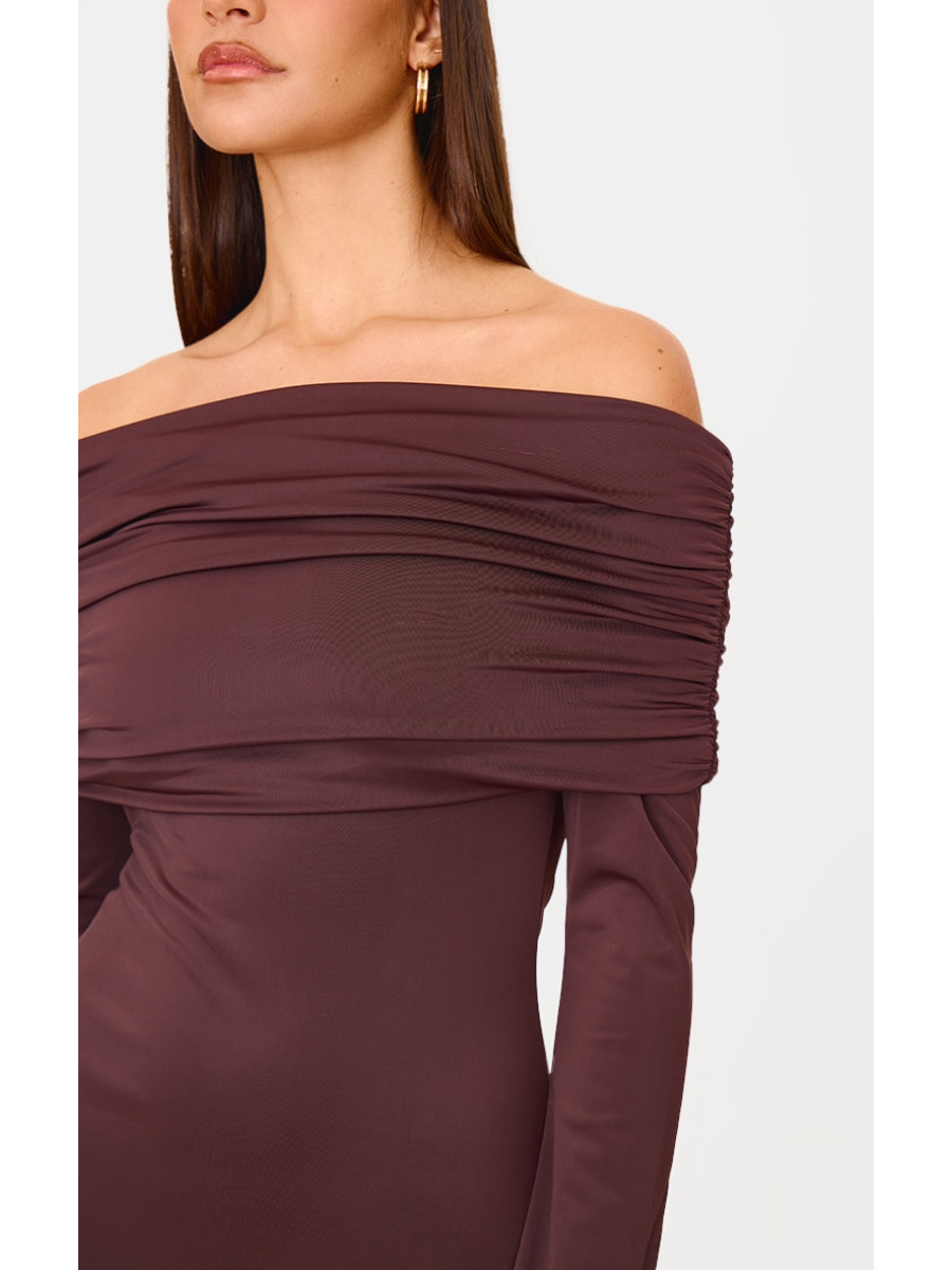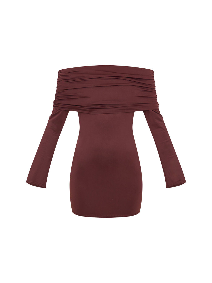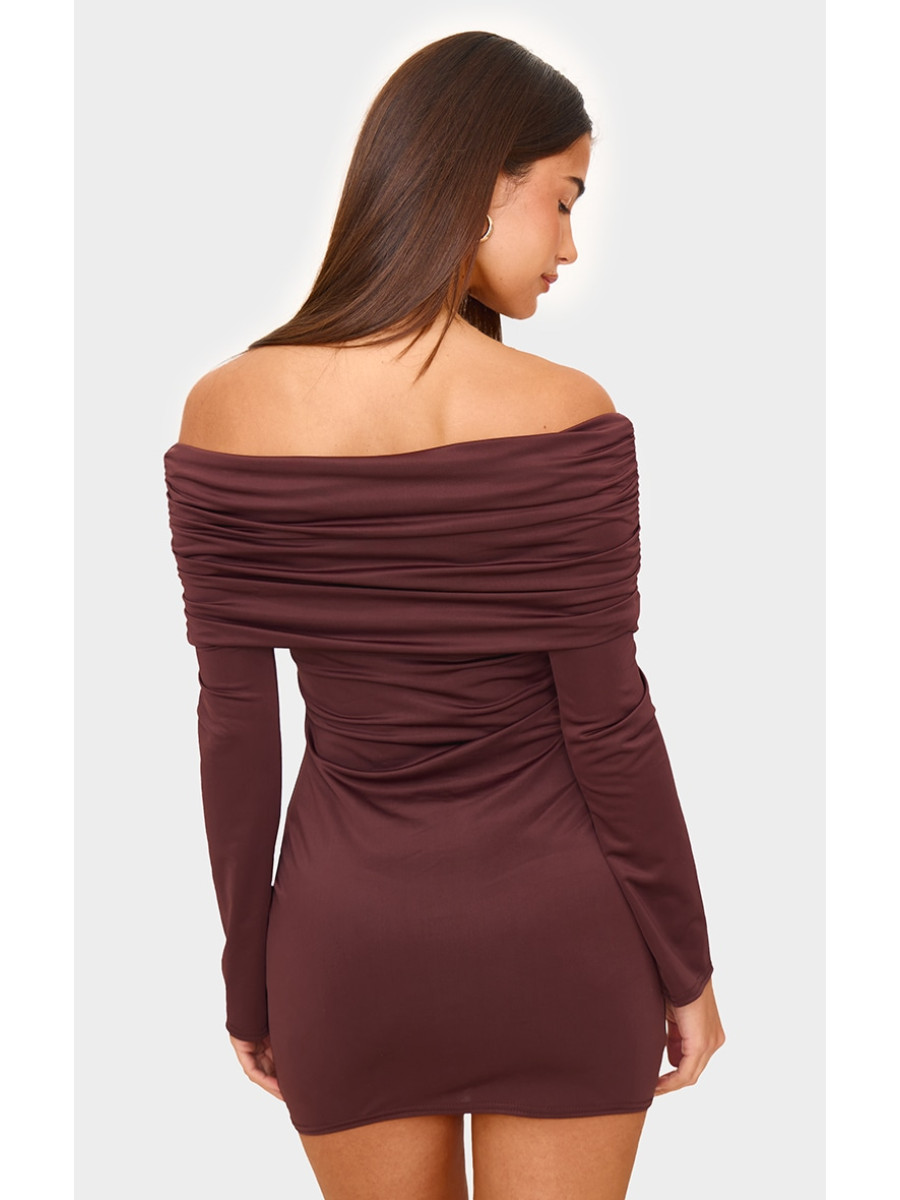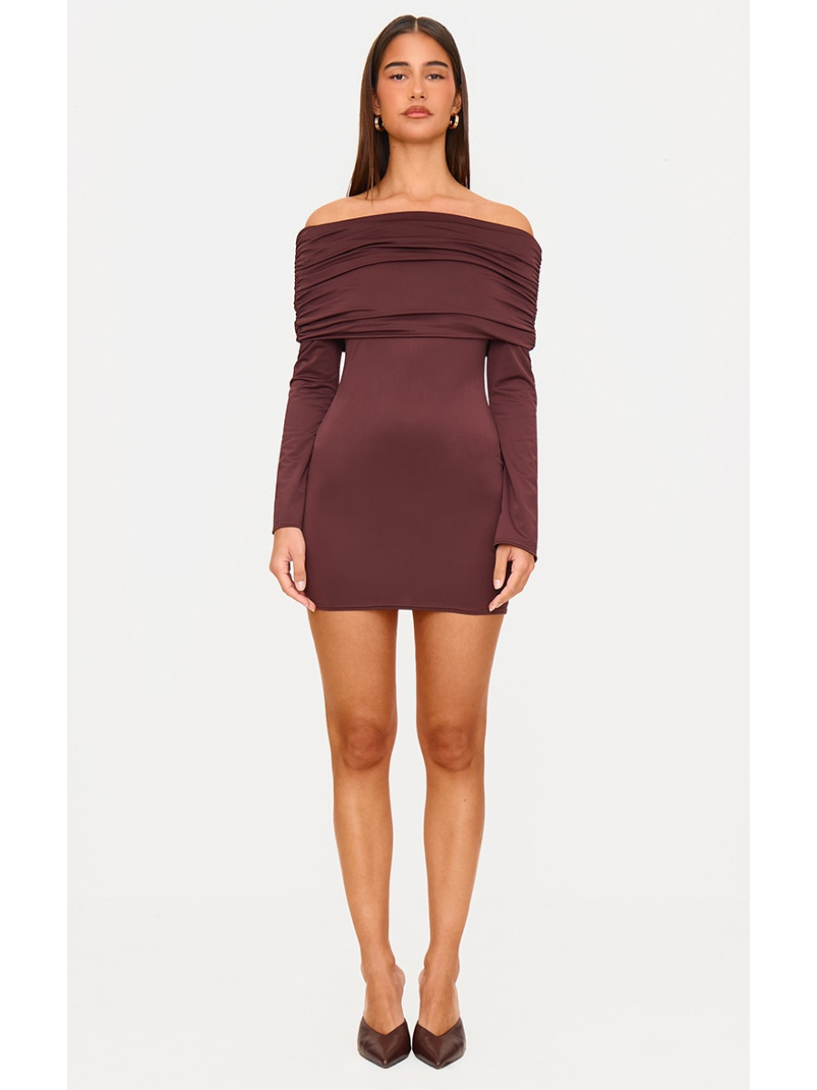 Шоколадна матова скульптурна двошарова міні-сукня Бардо з довгим рукавом і розкладним рукавом