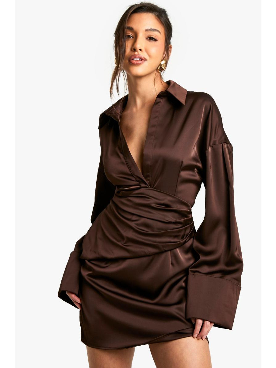Атласна сорочкова міні-сукня з розкльошеними рукавами