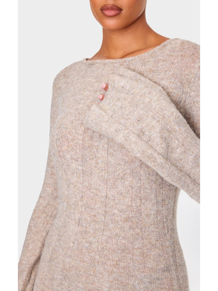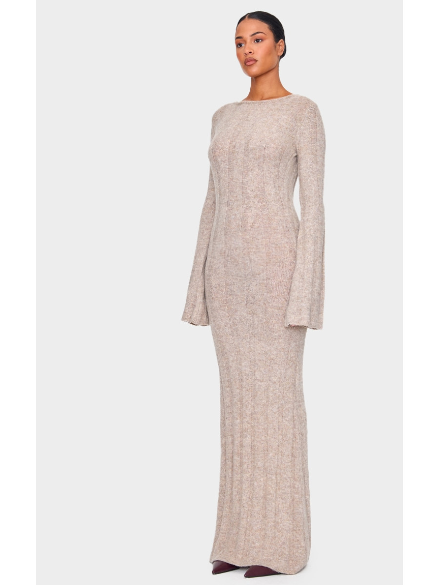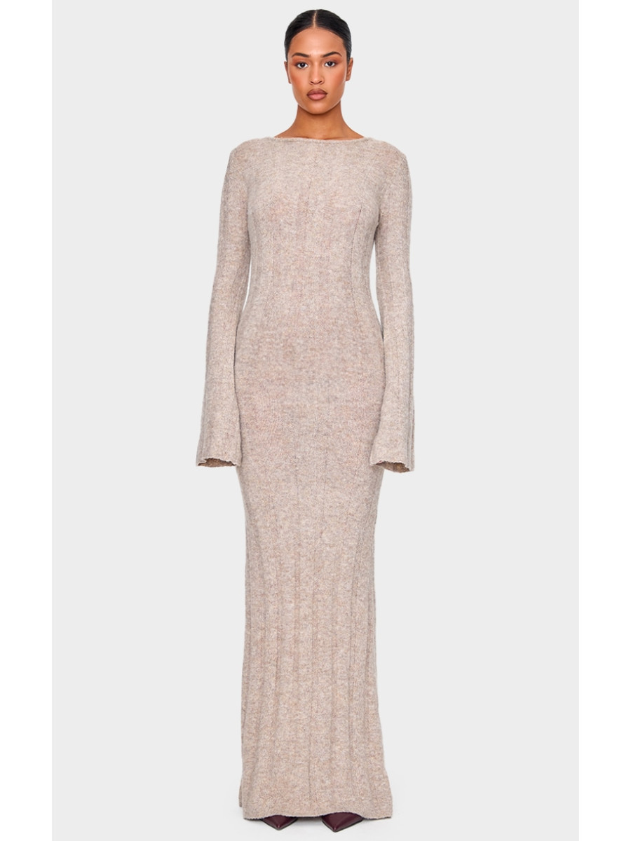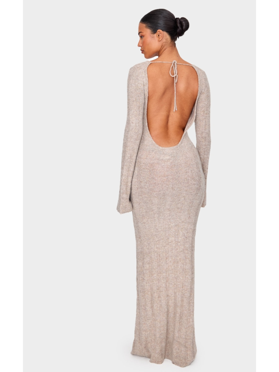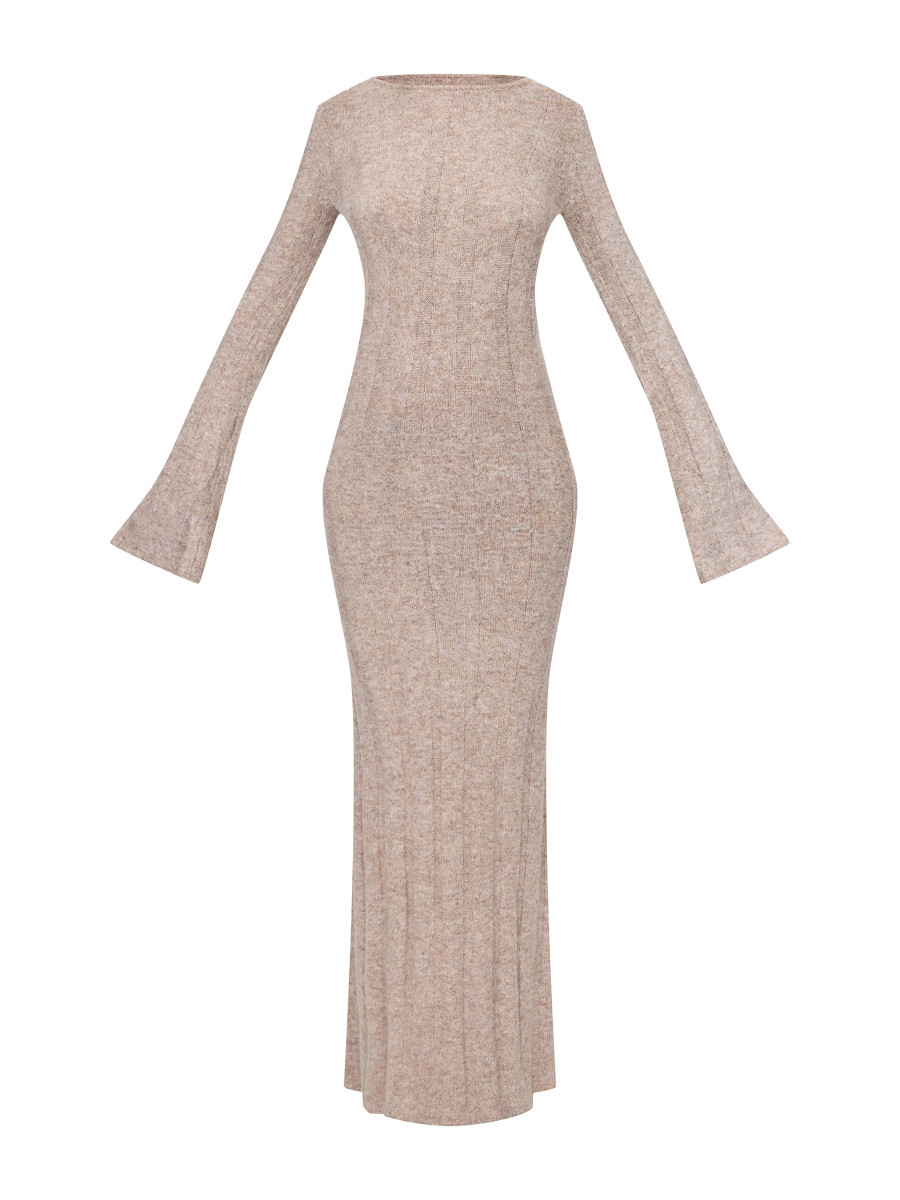 Висока темно-сіра трикотажна сукня з відкритою спиною в рубчик