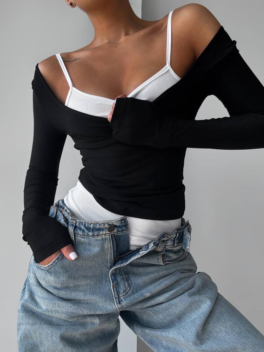 Лонгслів 2в1 Розмір 42-46 единий Мод. Тканина:трикотаж масло +рубчик Колір:чорний+білий, сірий+білий Лонглів 2в1 с комбінованим та спокусливим вирізом відмінно доповнить ваш стиль та поєднуватиметься з будь-якими речами з вашого гардеробу