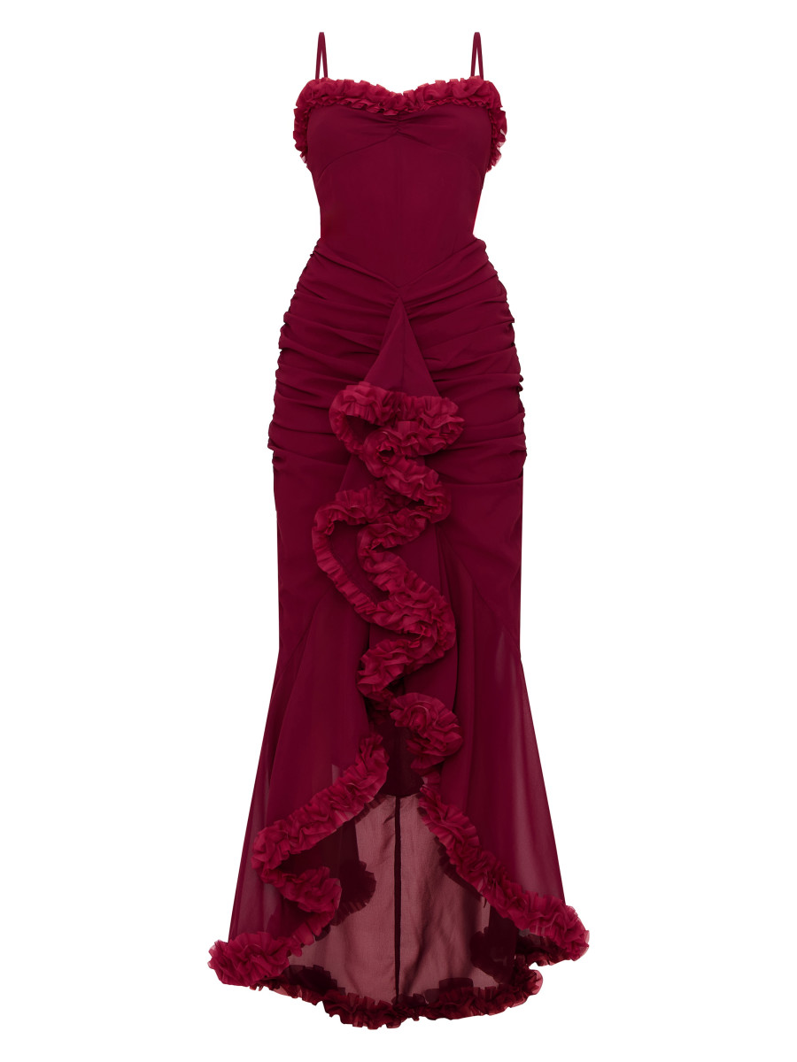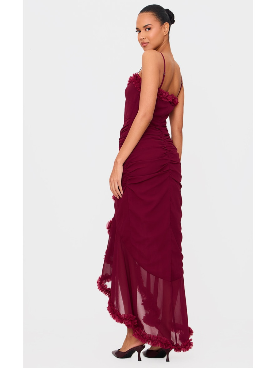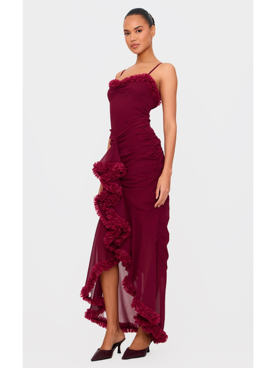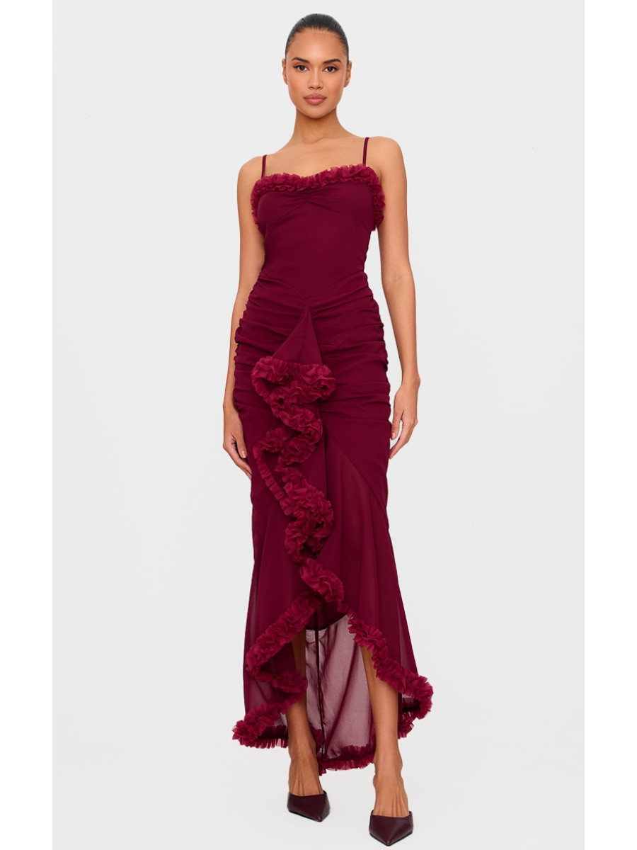 Бордова максі-сукня на ремінцях із рюшами та драпіруванням