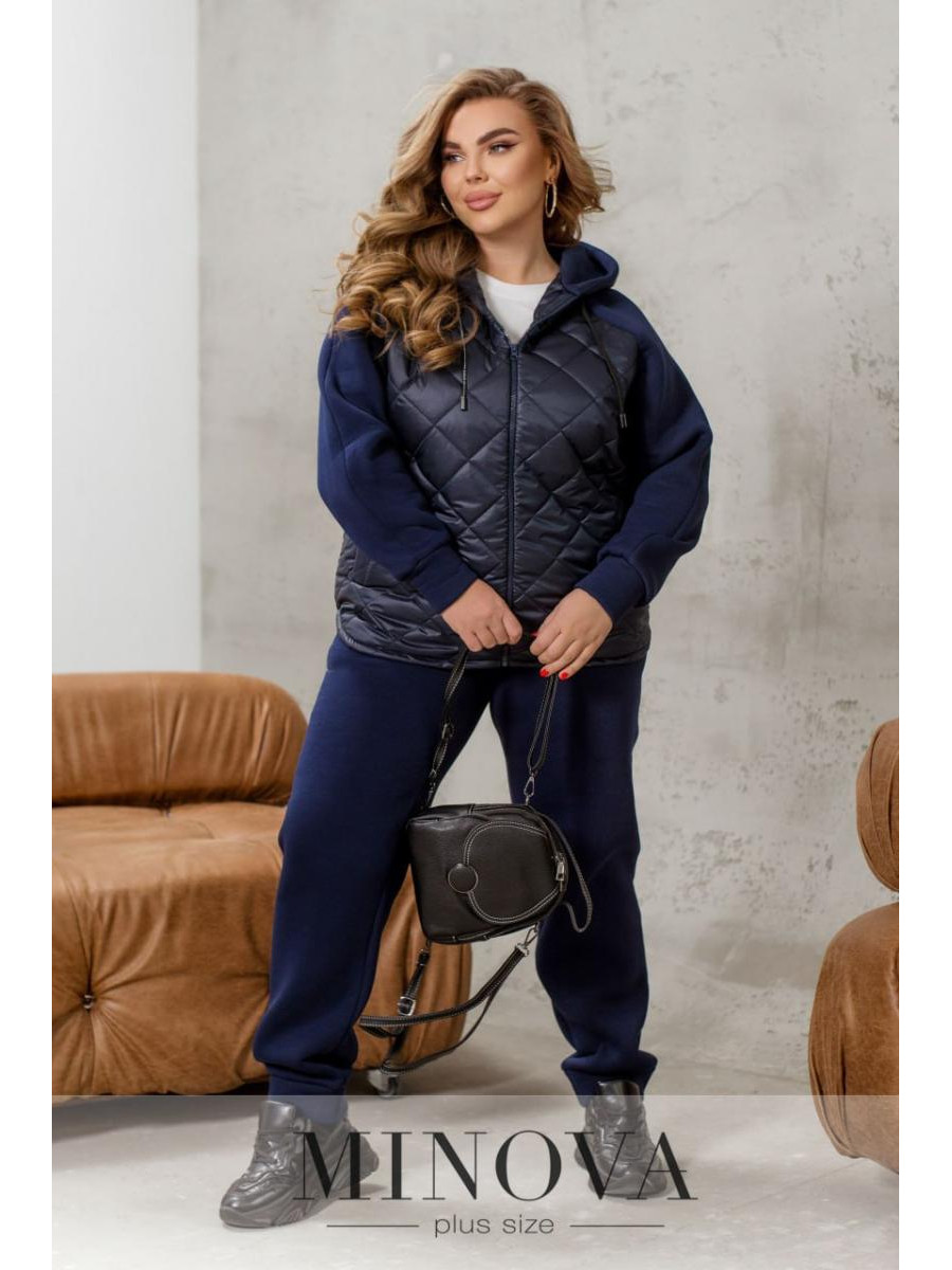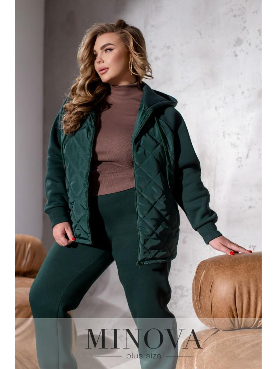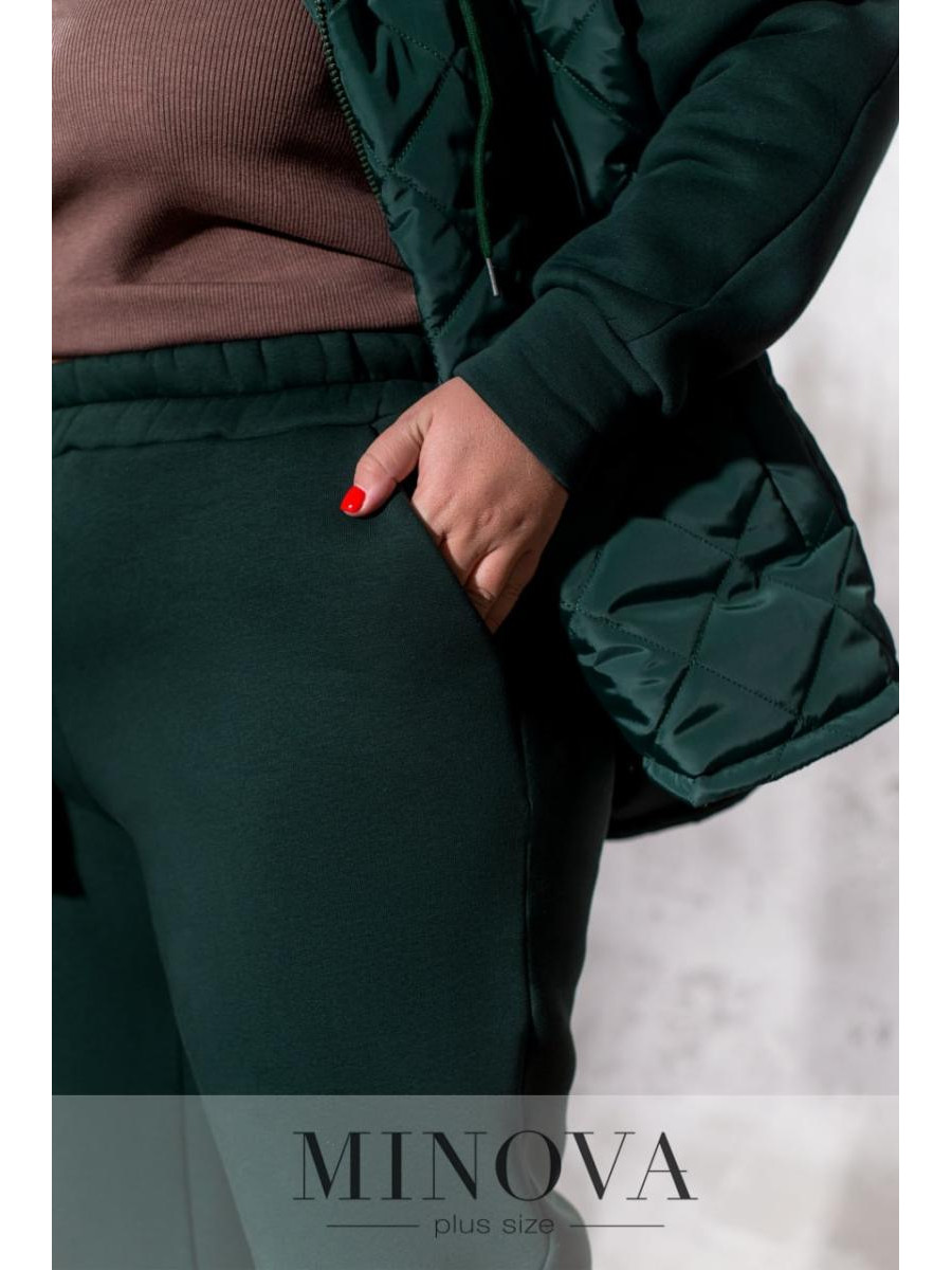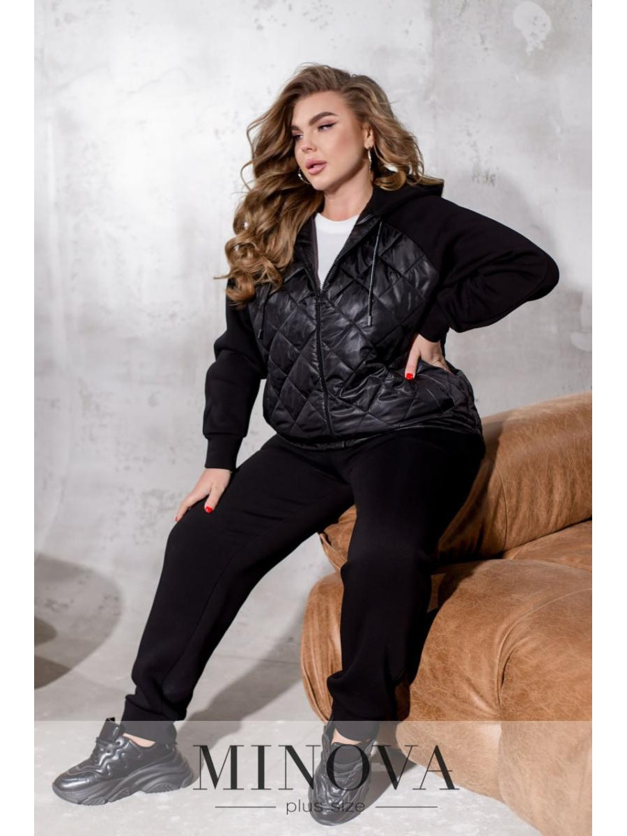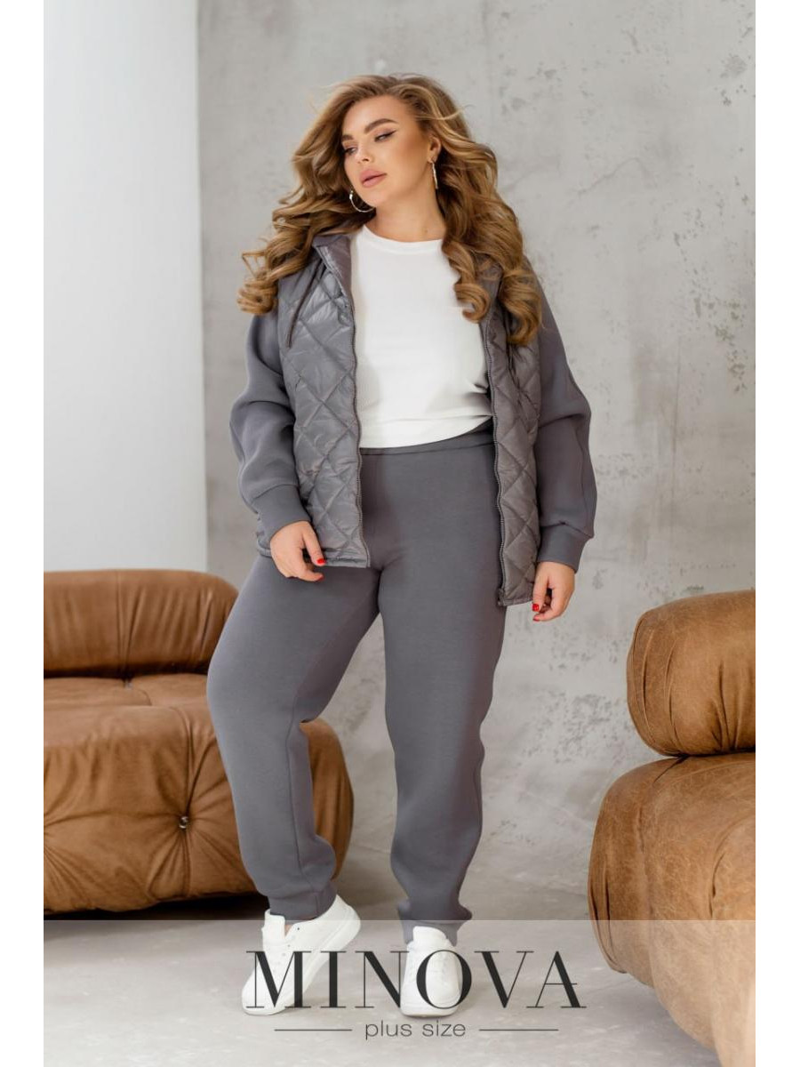 Спортивний костюм із кофтою на змійці, пошитий із поєднання тканин «стежка» та трьохнитки, створений для комфорту та стилю. Кофта оснащена капюшоном зі шнурком, що проходить через люверси, забезпечуючи захист і регулювання. Спереду розташовані врізні кишені для зручності. Рукава з трьохнитки з манжетами забезпечують комфортну посадку. Штани з високою посадкою на еластичній гумці з боковими кишенями і манжетами внизу додають функціональності та забезпечують тепло. Ідеальний вибір для активного відпочинку чи повсякденних занять. На моделі представлений розмір 50-52