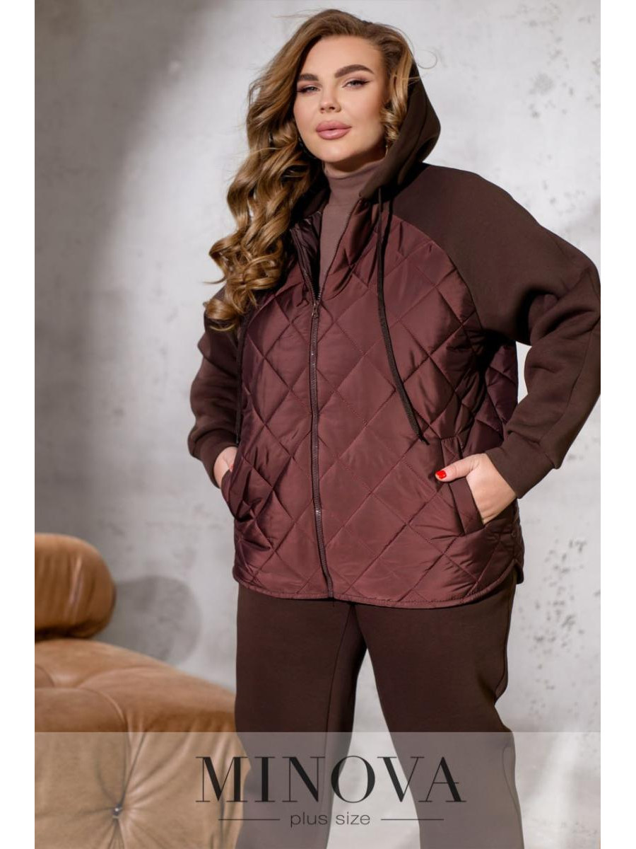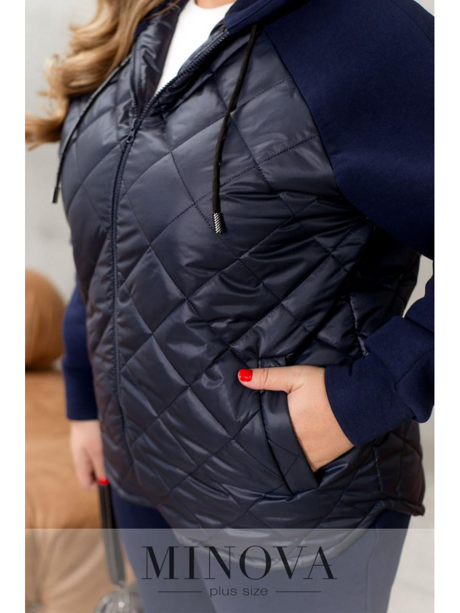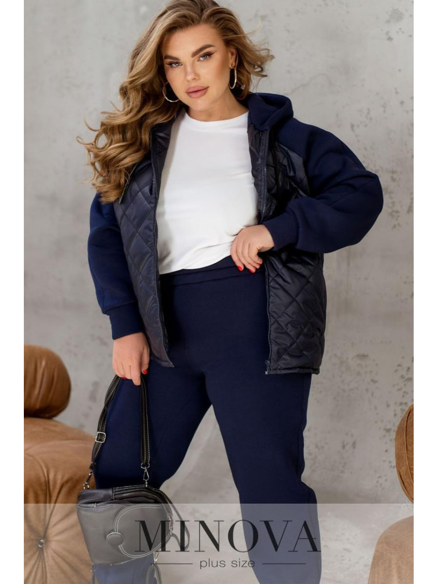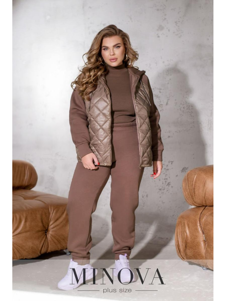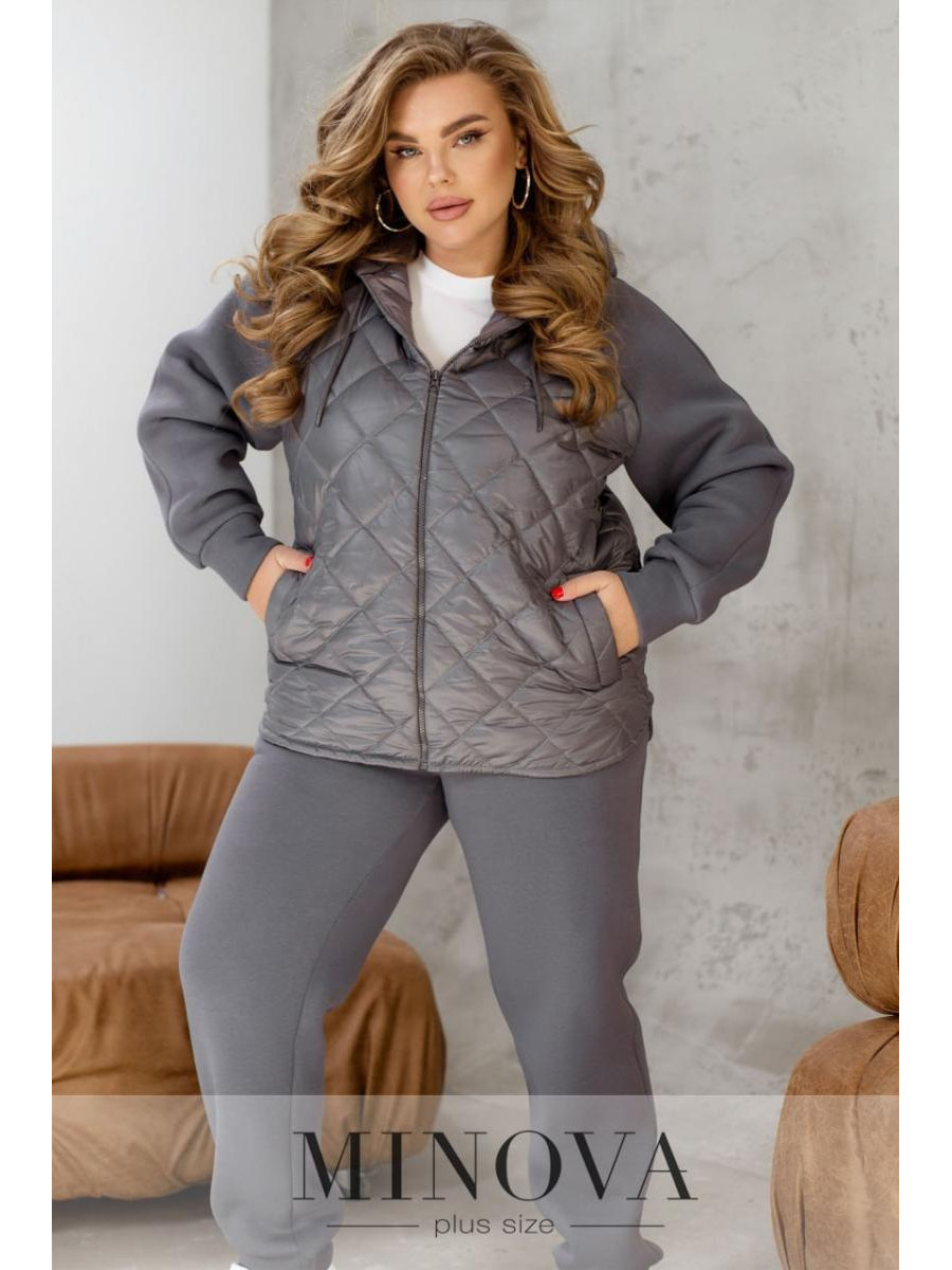 Спортивний костюм із кофтою на змійці, пошитий із поєднання тканин «стежка» та трьохнитки, створений для комфорту та стилю. Кофта оснащена капюшоном зі шнурком, що проходить через люверси, забезпечуючи захист і регулювання. Спереду розташовані врізні кишені для зручності. Рукава з трьохнитки з манжетами забезпечують комфортну посадку. Штани з високою посадкою на еластичній гумці з боковими кишенями і манжетами внизу додають функціональності та забезпечують тепло. Ідеальний вибір для активного відпочинку чи повсякденних занять. На моделі представлений розмір 50-52