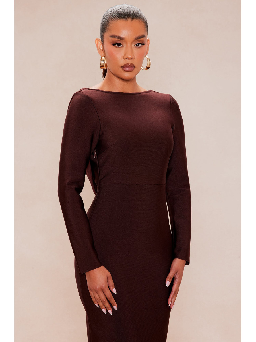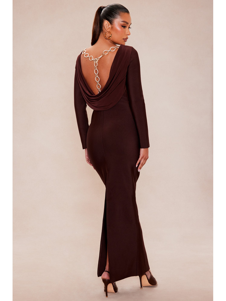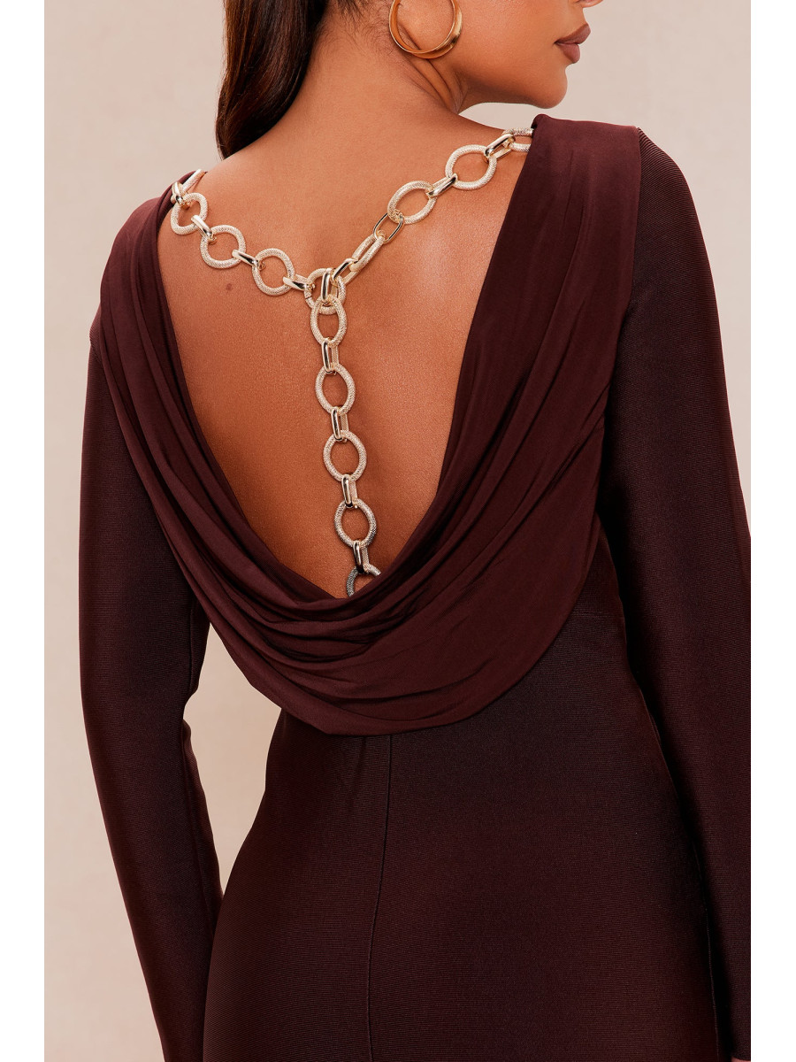 Додайте нотку гламуру до свого образу з цією вишуканою сукнею "Mariella" у стилі "бандаж" з відкритою спиною. Довгі рукави та високий комір створюють елегантний силует, а глибокий розріз ззаду додає грайливості. Вишуканий дизайн з відкритою спиною та детальним оздобленням ланцюжком привертатиме захоплені погляди. Прихована бічна блискавка забезпечує ідеальну посадку, а еластична тканина гарантує комфорт.