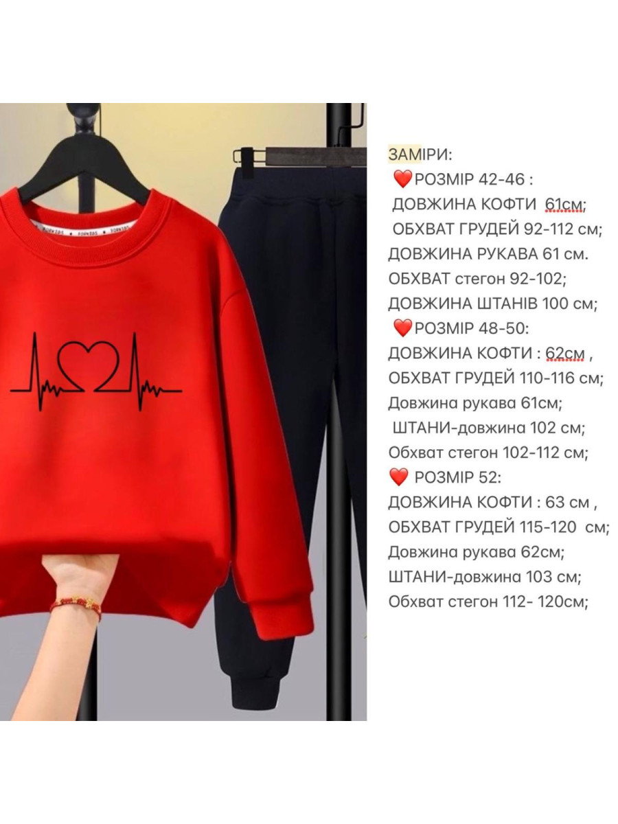 Костюм жіночий (кофта +штани) ▪️Модель: ▪️ Розміри: 42-46, 48-50, 50-52 Кольори: Червоний, електрик, сірий ( меланж), зелений (бутилка) Тканина: тринитка на флісі, якісний накат Кофта з манжетами, штани з кишенями.