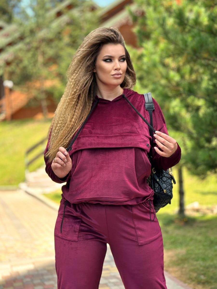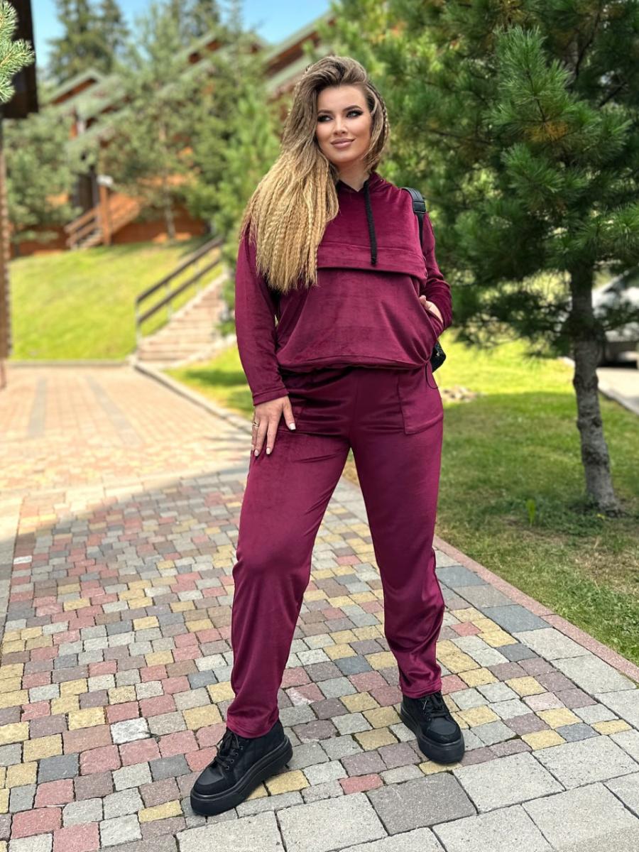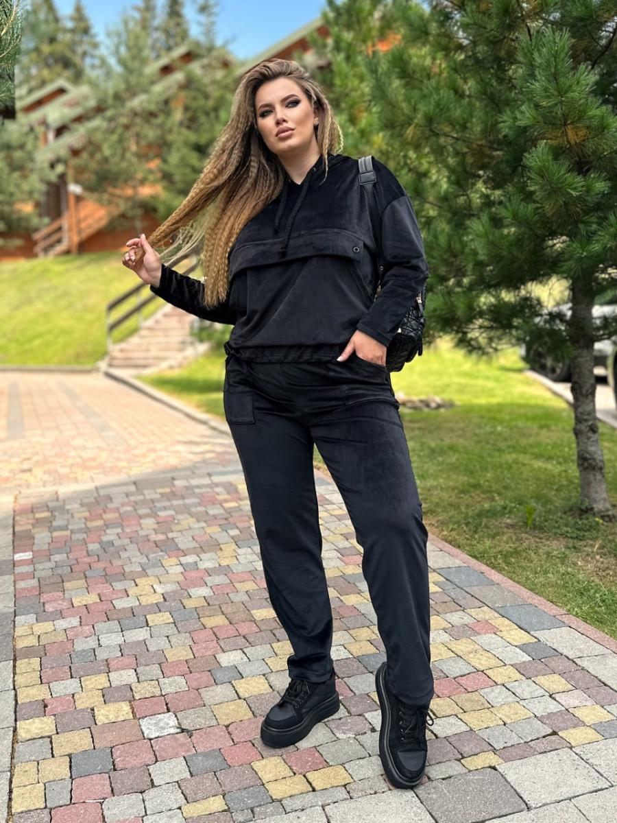 Шикарний прогулянковий велюровий костюмчик. Кофта з капюшоном, регулюється затяжками. Є великий карман-кенгуру. Штани прямі, талія на резинці, накладні кишені. Дуже зручний, легенький та стильний костюмчик.