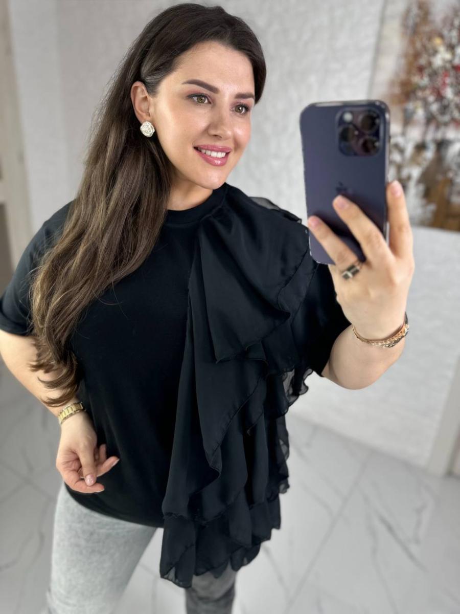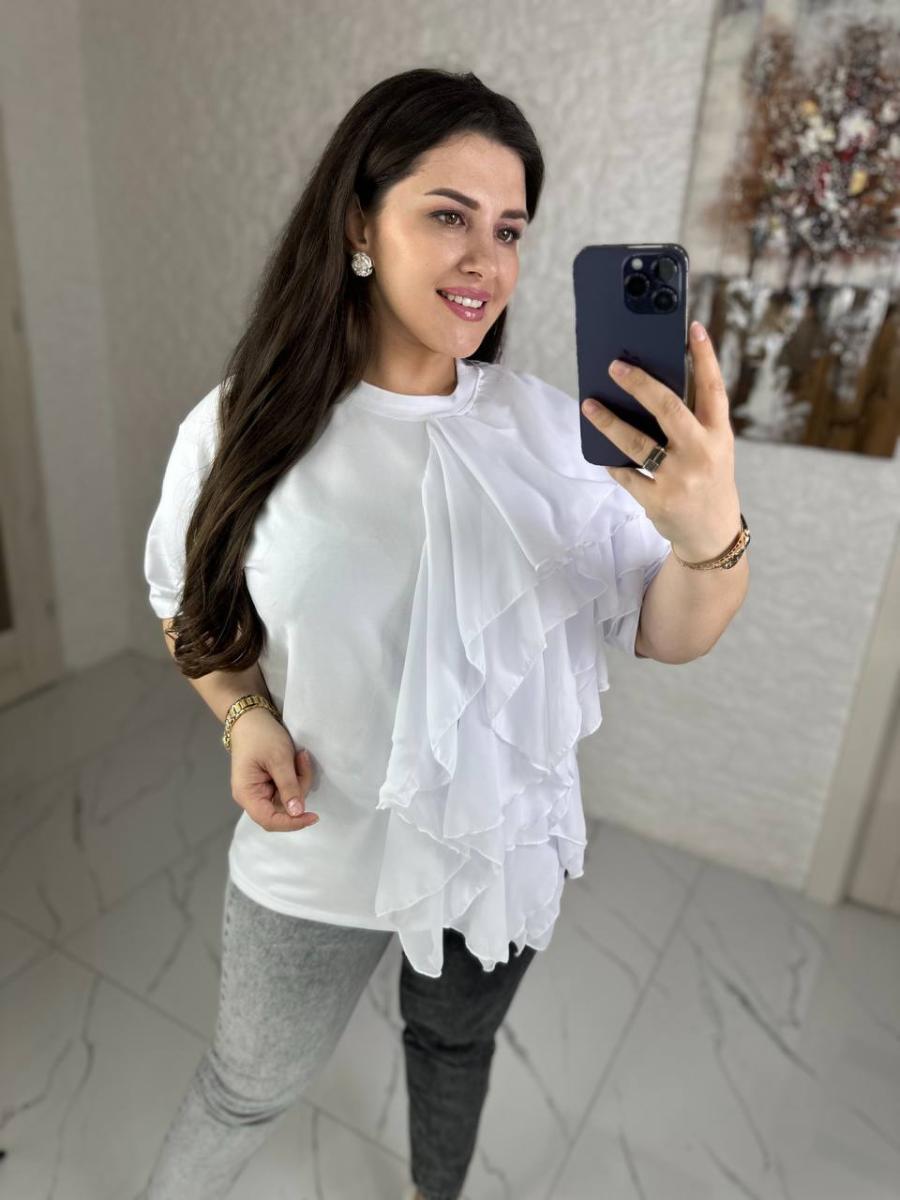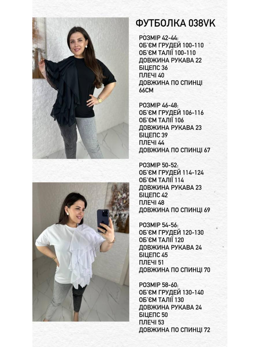 Розміри: 42-44;46-48;50-52;54-56;58-60 Тканина: основа-кулір; волани-шифон Футболка з турецького куліру, дуже гарної якості, який прослужить вам не один рік, не кошлатиться, приємний на дотик, не парить. Головна цікавинка- волани з шифону, які гарно тримають форму і роблять ваш образ неповторним.
