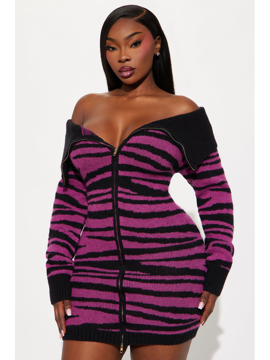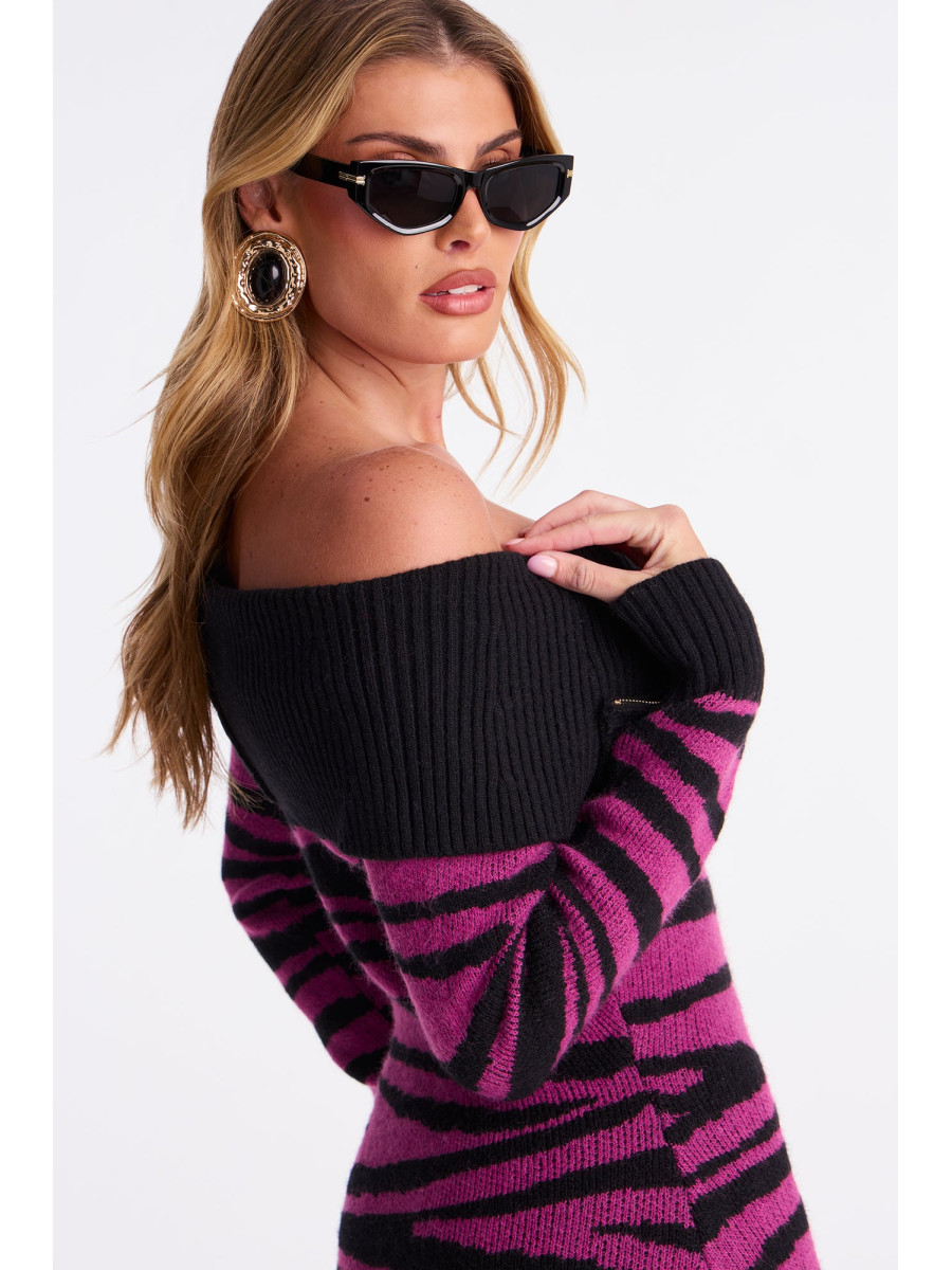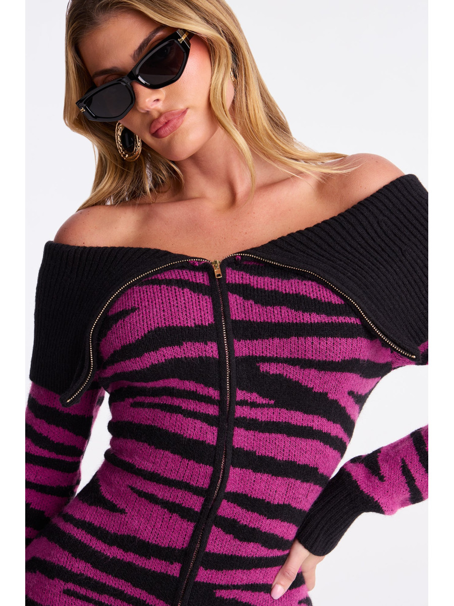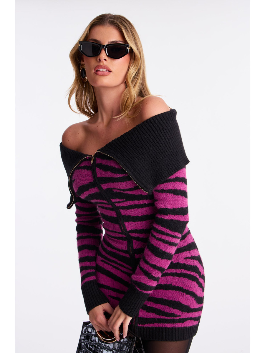 Ця светр-сукня "Cameron" з ефектним анімалістичним принтом та спущеними плечима стане справжньою родзинкою вашого гардеробу. Довгі рукави та стильний комір з відворотом створюють виразний образ. Застібка-блискавка спереду додає сукні динамічності, а еластична тканина забезпечує комфортну посадку. Ця модель ідеально підійде для створення ефектних та модних образів.