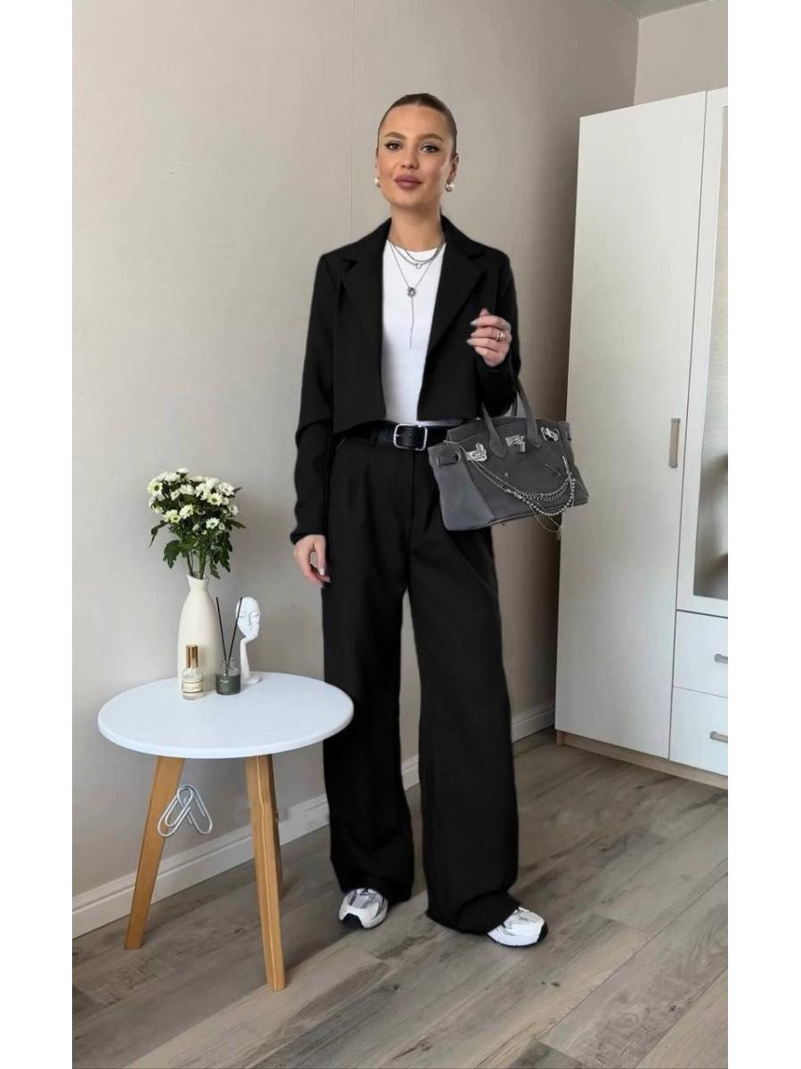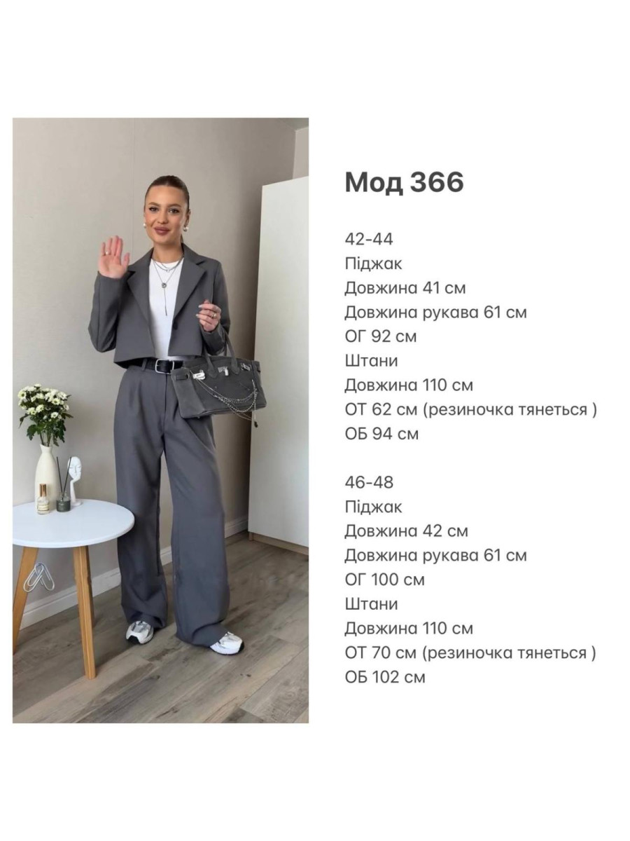 Мод Розмір: 42-44, 46-48 Тканина: Костюмка Колір: графіт , чорний Вкорочений піджак та штани палаццо — ідеальний образ в вашому гардеробі ! Пояс +50 грн !
