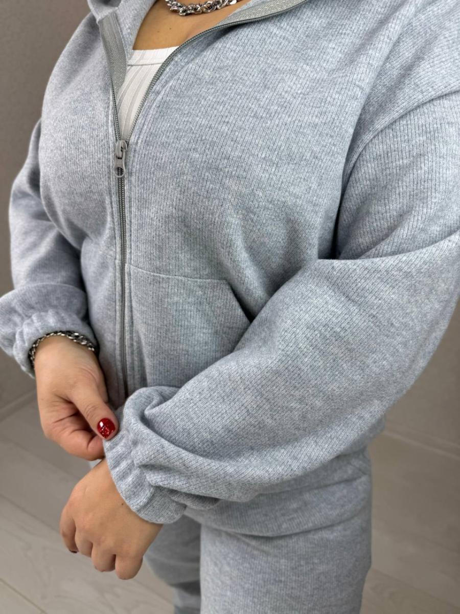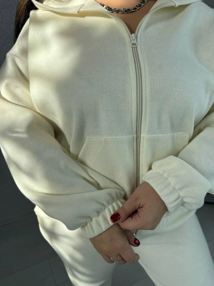 Костюм -двійка : кофта на молнії в колір основи , кишені -кенгуру , рукава та низ на резинці , глибокий капюшон ; штани на резинці , висока посадка , з боків кишені , по низу резинка Параметри моделі -батал ОГ110, ОТ88, ОС112, зріст 165см , на ній розмір 50-52. Заміри виробу : Розмір 46-48: Кофта : Об’єм грудей 124 Об’єм талії 80-100 Довжина рукава від шва 48 Довжина по спинці 61 Штани : Об’єм Талії 68-88 Об’єм стегон 108 Довжина по зовнішньому шву 105 Довжина по внутрішньому шву 77