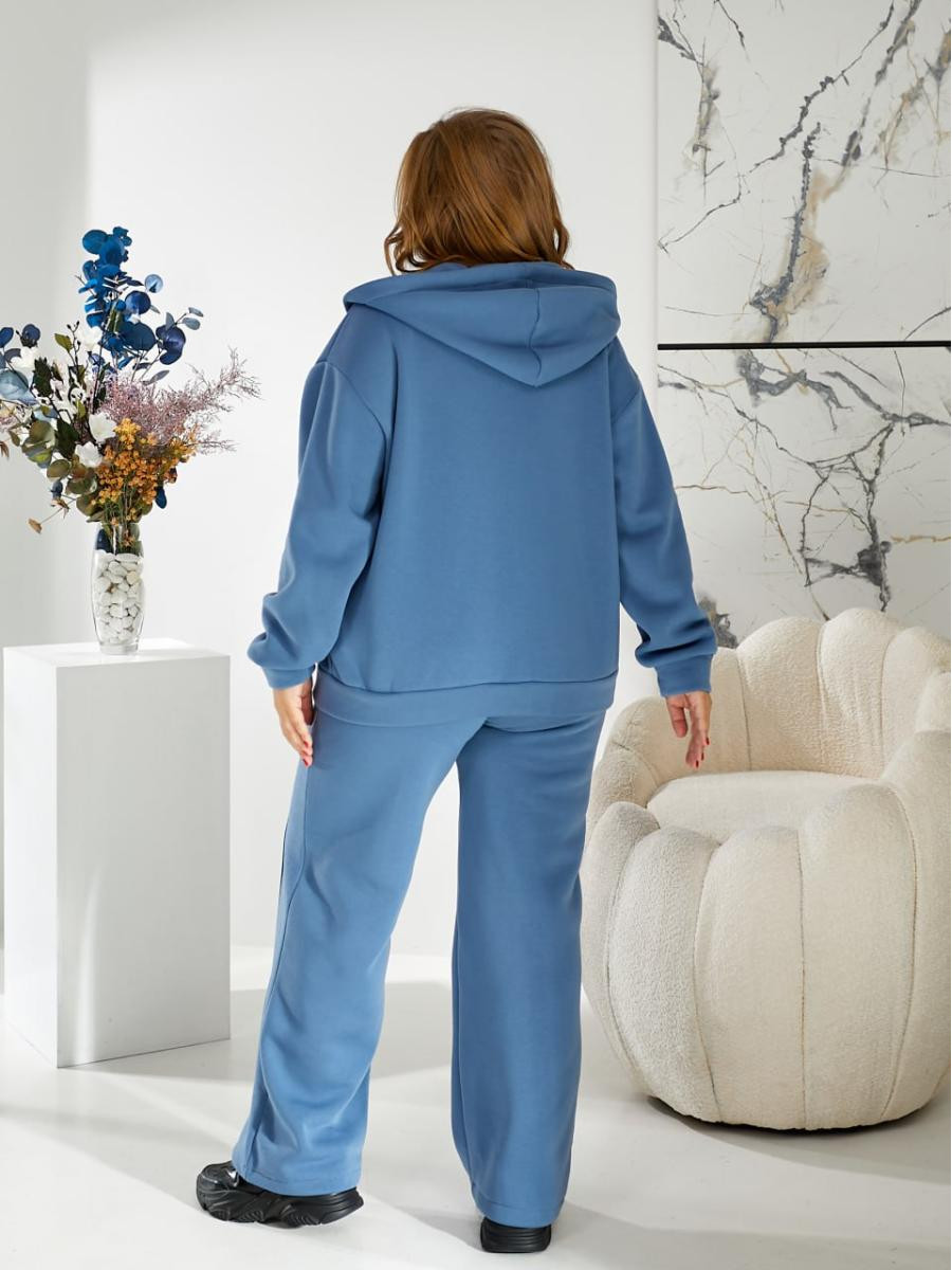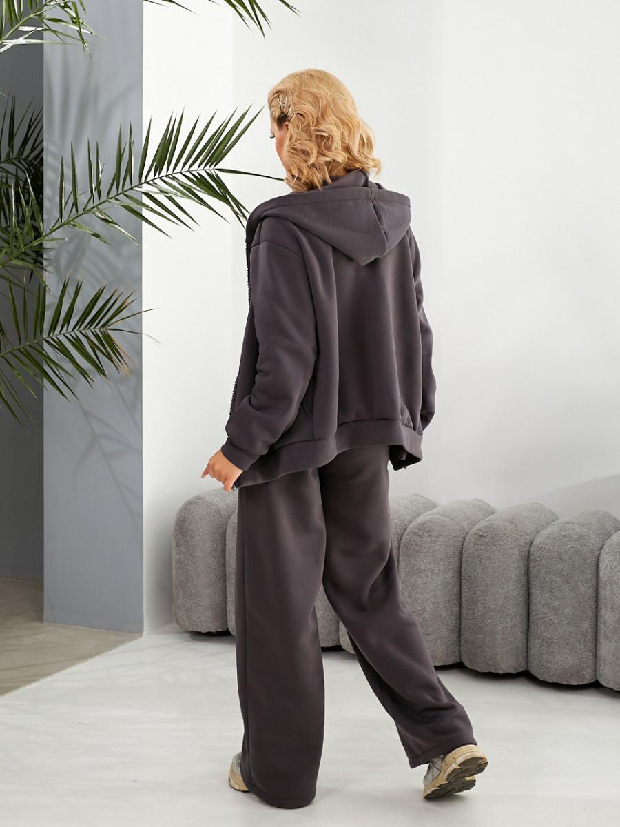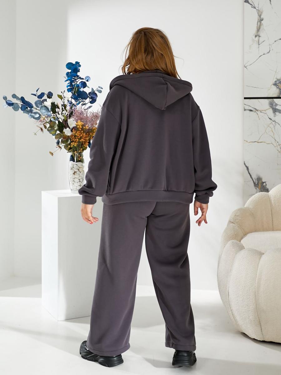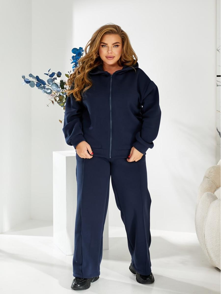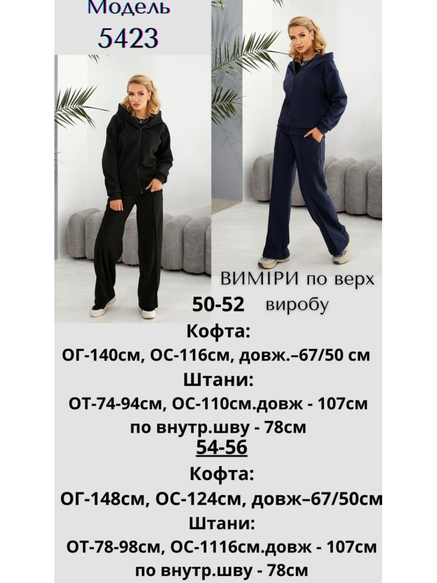 Спортивний костюм модель – 723-5423 Матеріал: тринитка з начісом високої якості Розміри: 42-44, 46-48 — Розміри: 50-52, 54-56 Кольори: чорний, темно-сірий, темно-синій, джинсовий Кофта вільного крою з капюшоном, застібається на блискавку Штани палаццо зі стрілками, 2-і кишені. ВИМІРИ модель 723-5423 42-44: Кофта: ОГ-116см, ОС-96см, довжина – 66см, рукав по внутр.шву — 50см Штани: ОТ-64см-86см, ОС-90см довжина — 107см, по внутр.шву — 78см 46-48: Кофта: ОГ-130см, ОС-106см, довжина – 66см, рукав по внутр.шву — 50см Штани: ОТ-68см-90см, ОС-102см довжина — 107см, по внутр.шву — 78см 50-52: Кофта: ОГ-140см, ОС-116см, довжина – 67см, рукав по внутр.шву — 50см Штани: ОТ-74см-94см, ОС-110см довжина — 107см, по внутр.шву — 78см 54-56: Кофта: ОГ-148см, ОС-124см, довжина – 67см, рукав по внутр.шву — 50см Штани: ОТ-78см-98см, ОС-116см довжина — 107см, по внутр.шву — 78см