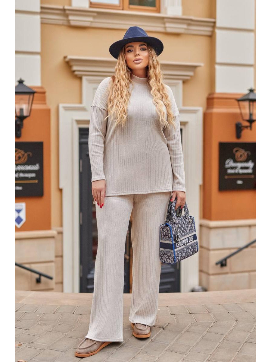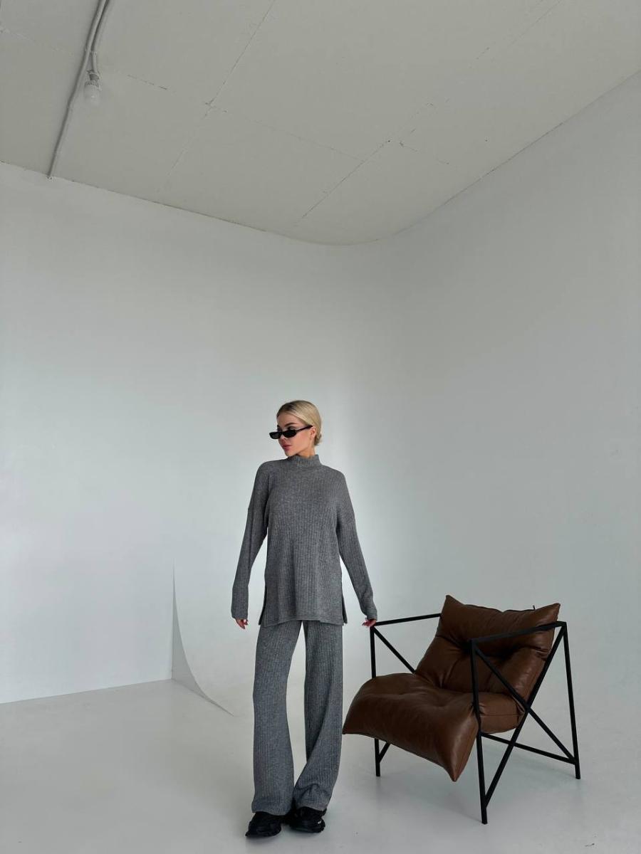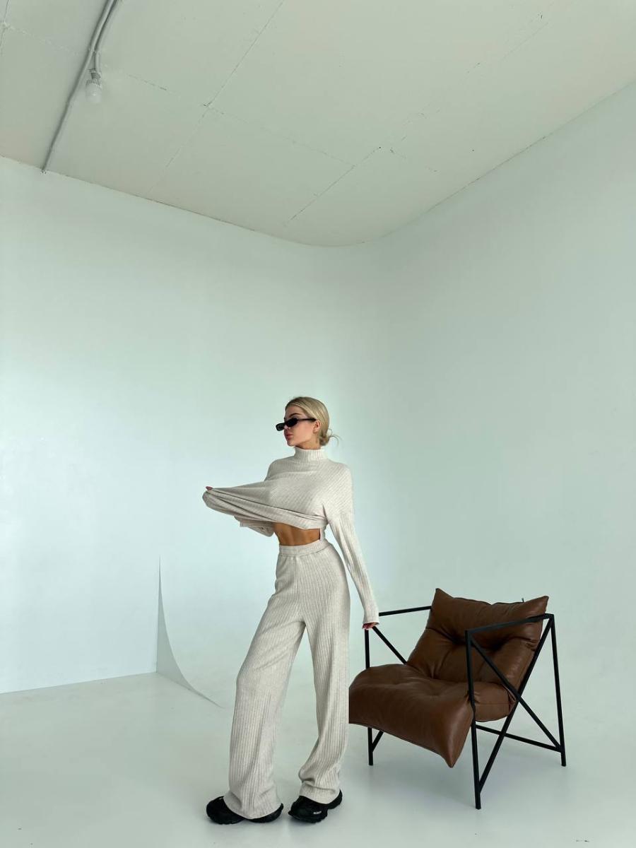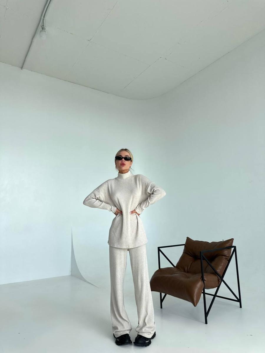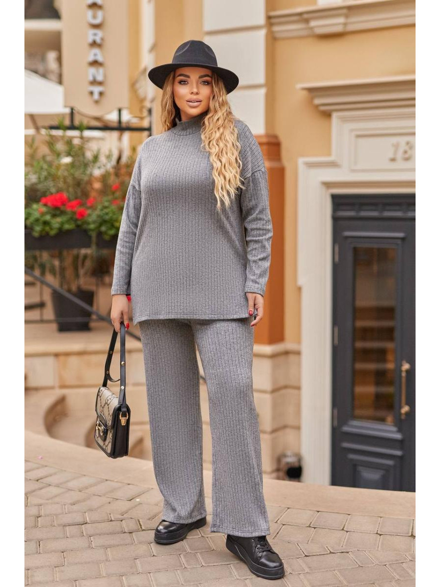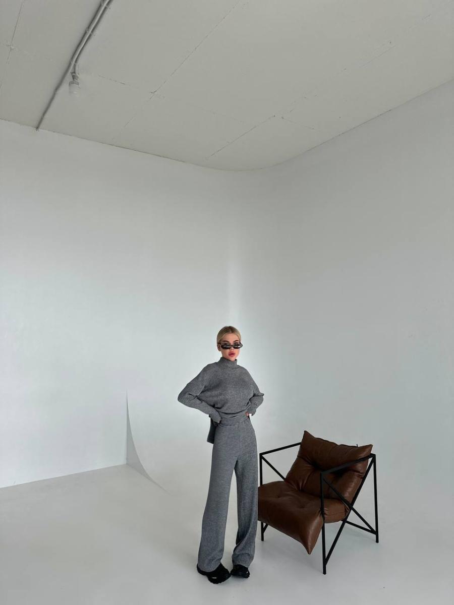 Модель Жіночий костюм Розмірний ряд 42-44;46-48;50-52 Кольори сірий, беж, шоколад та чорний Костюм з вільними по крою брюками, у талії передбачена еластична вставка для комфорту