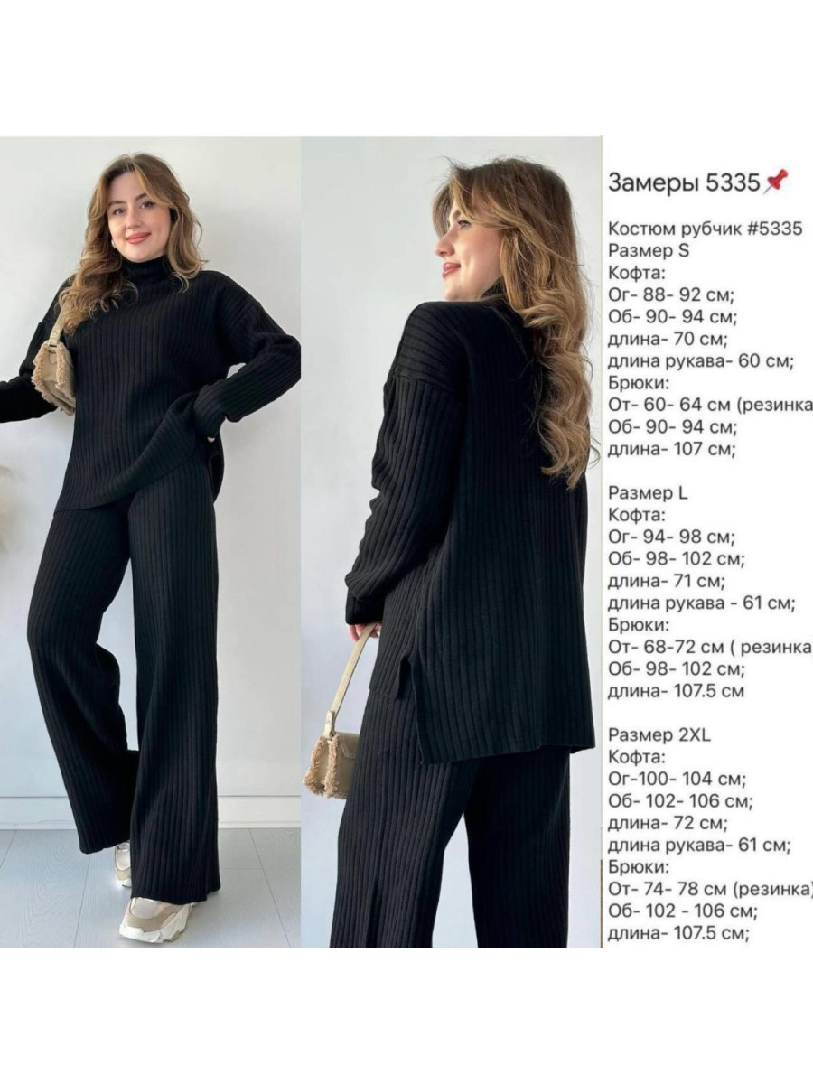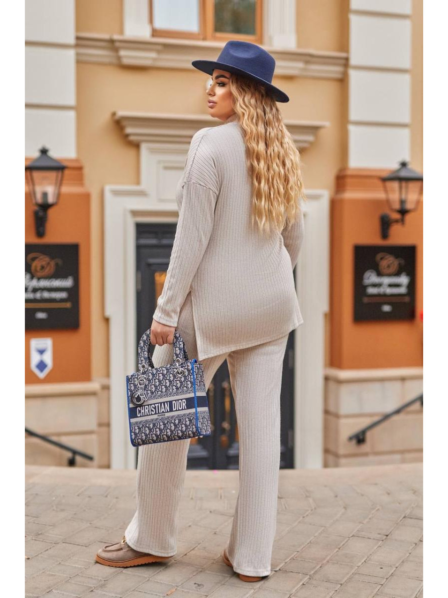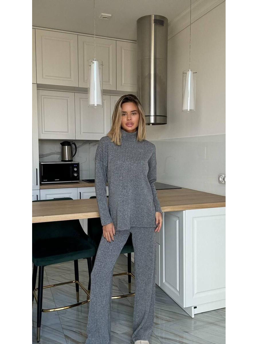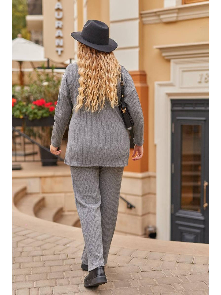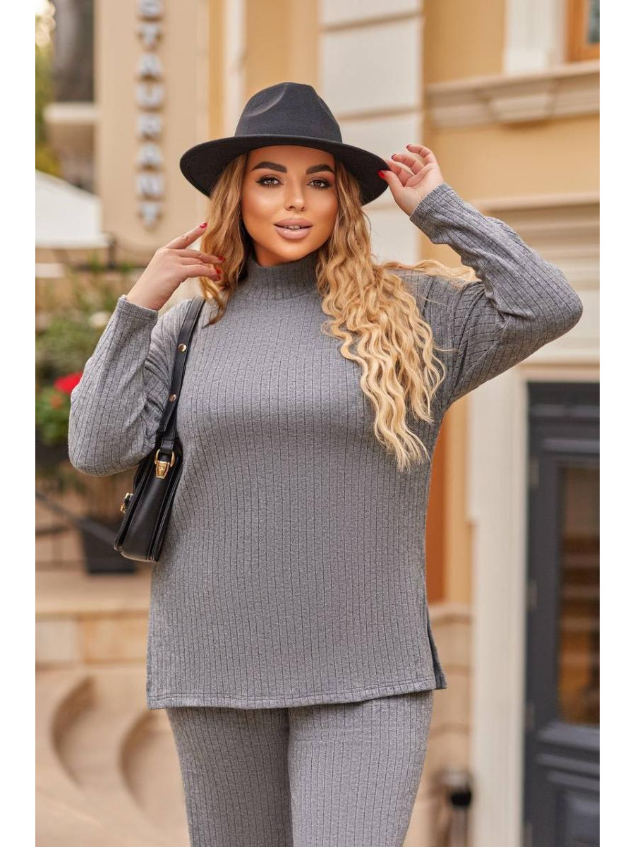 Модель Жіночий костюм Розмірний ряд 42-44;46-48;50-52 Кольори сірий, беж, шоколад та чорний Костюм з вільними по крою брюками, у талії передбачена еластична вставка для комфорту