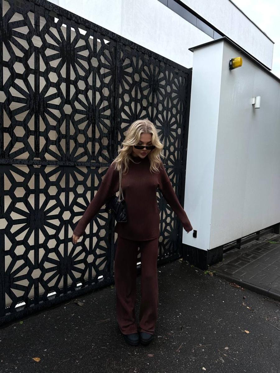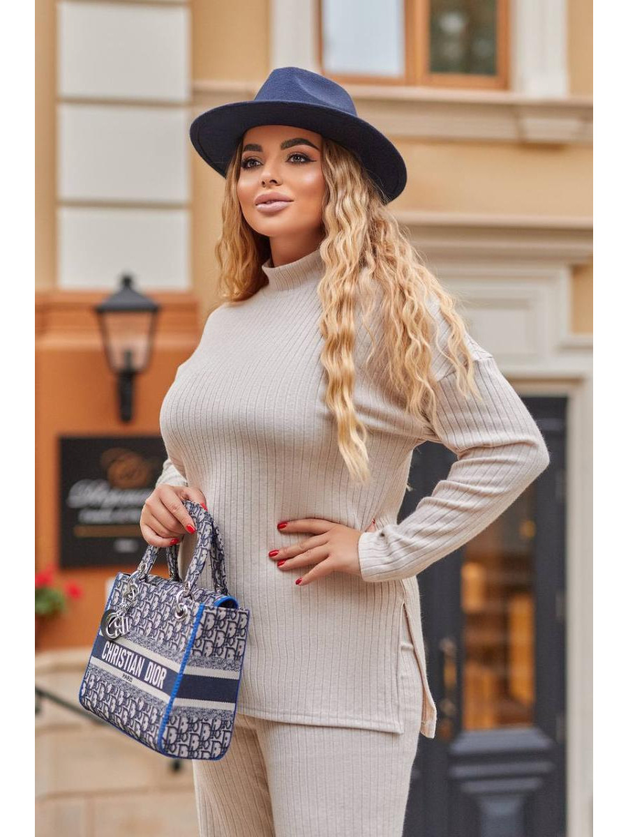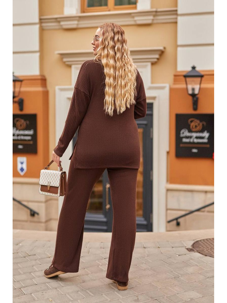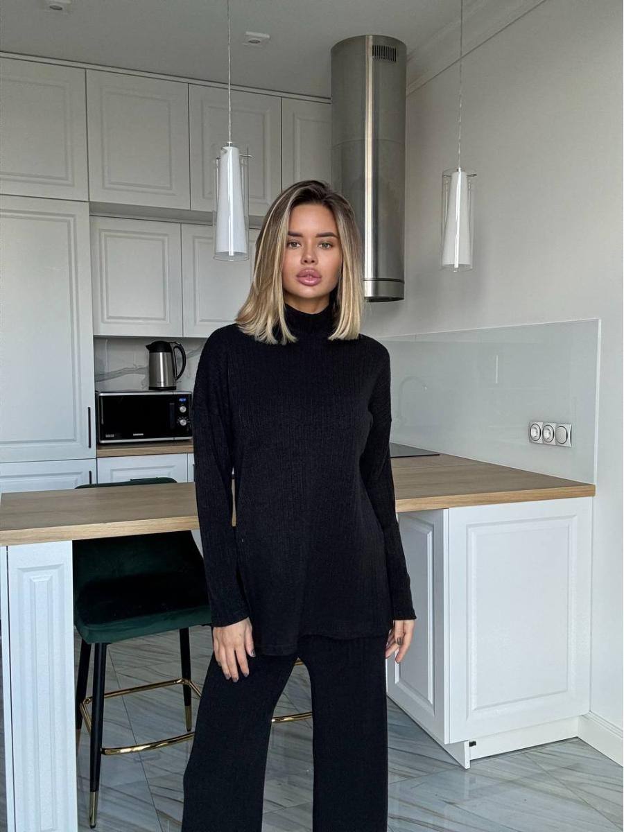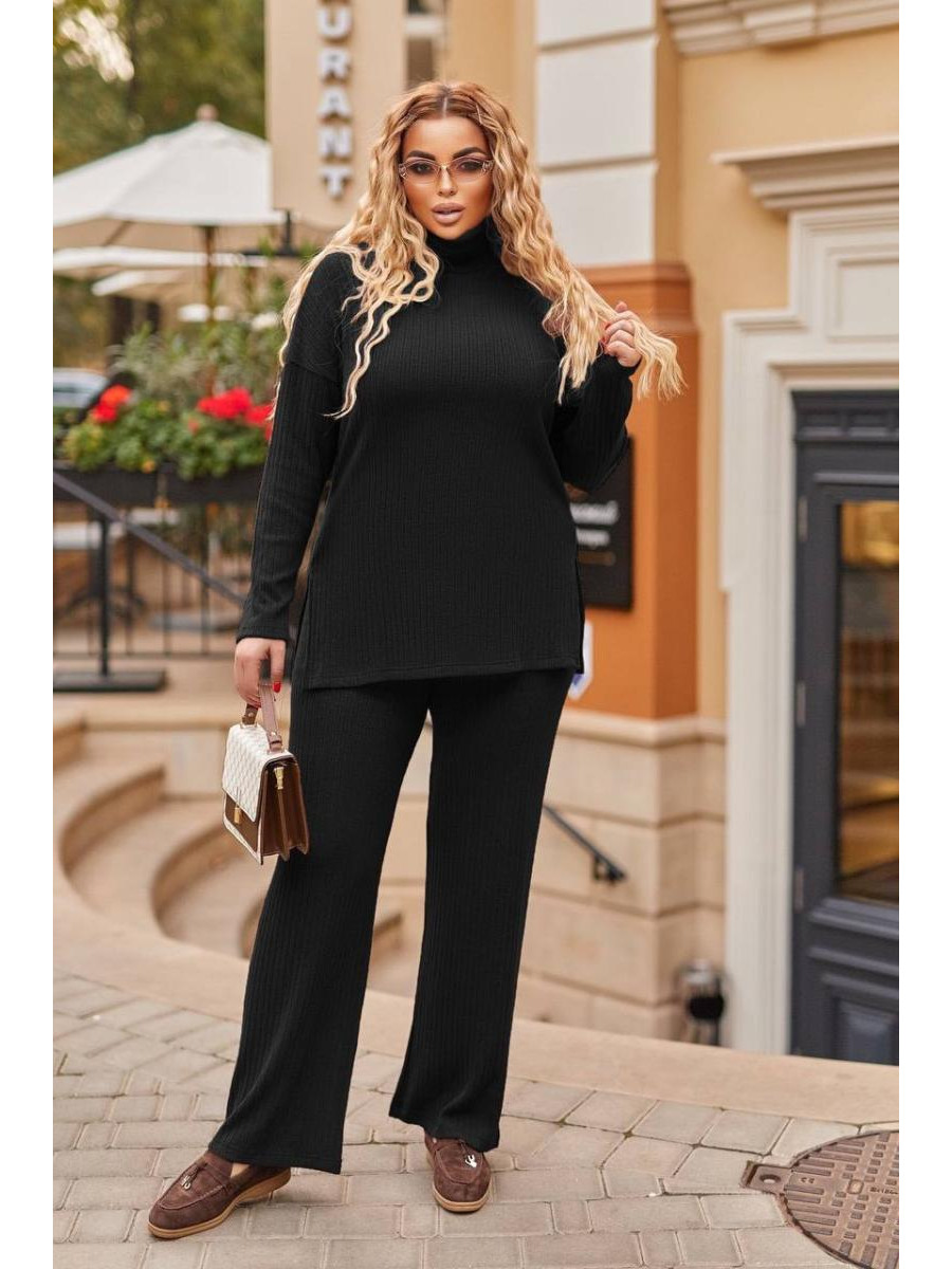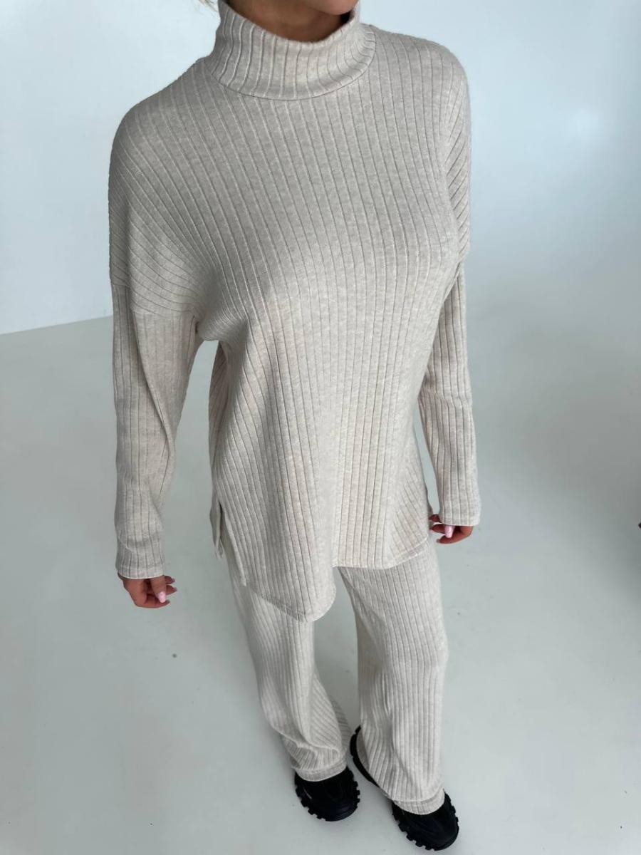 Модель Жіночий костюм Розмірний ряд 42-44;46-48;50-52 Кольори сірий, беж, шоколад та чорний Костюм з вільними по крою брюками, у талії передбачена еластична вставка для комфорту