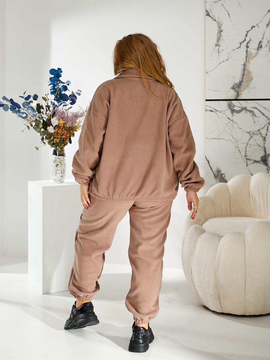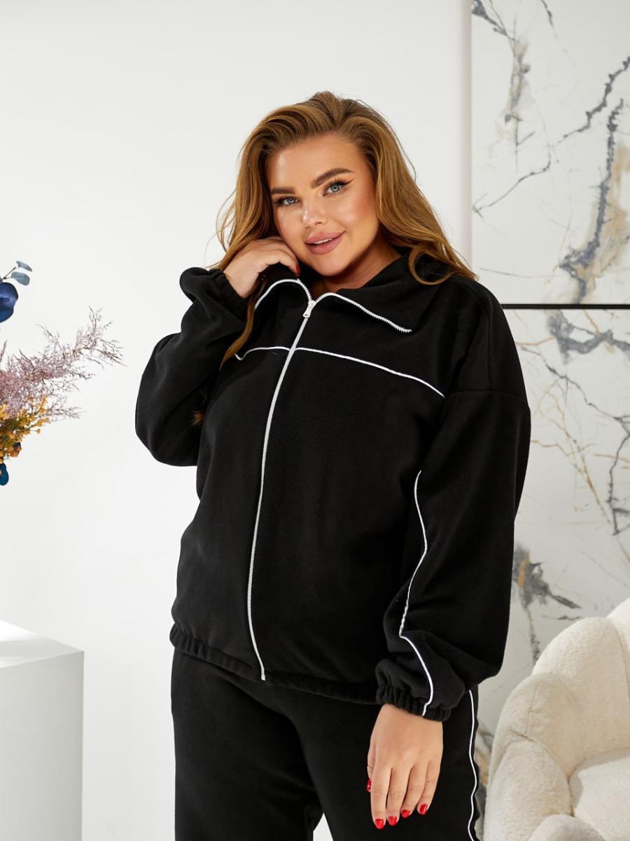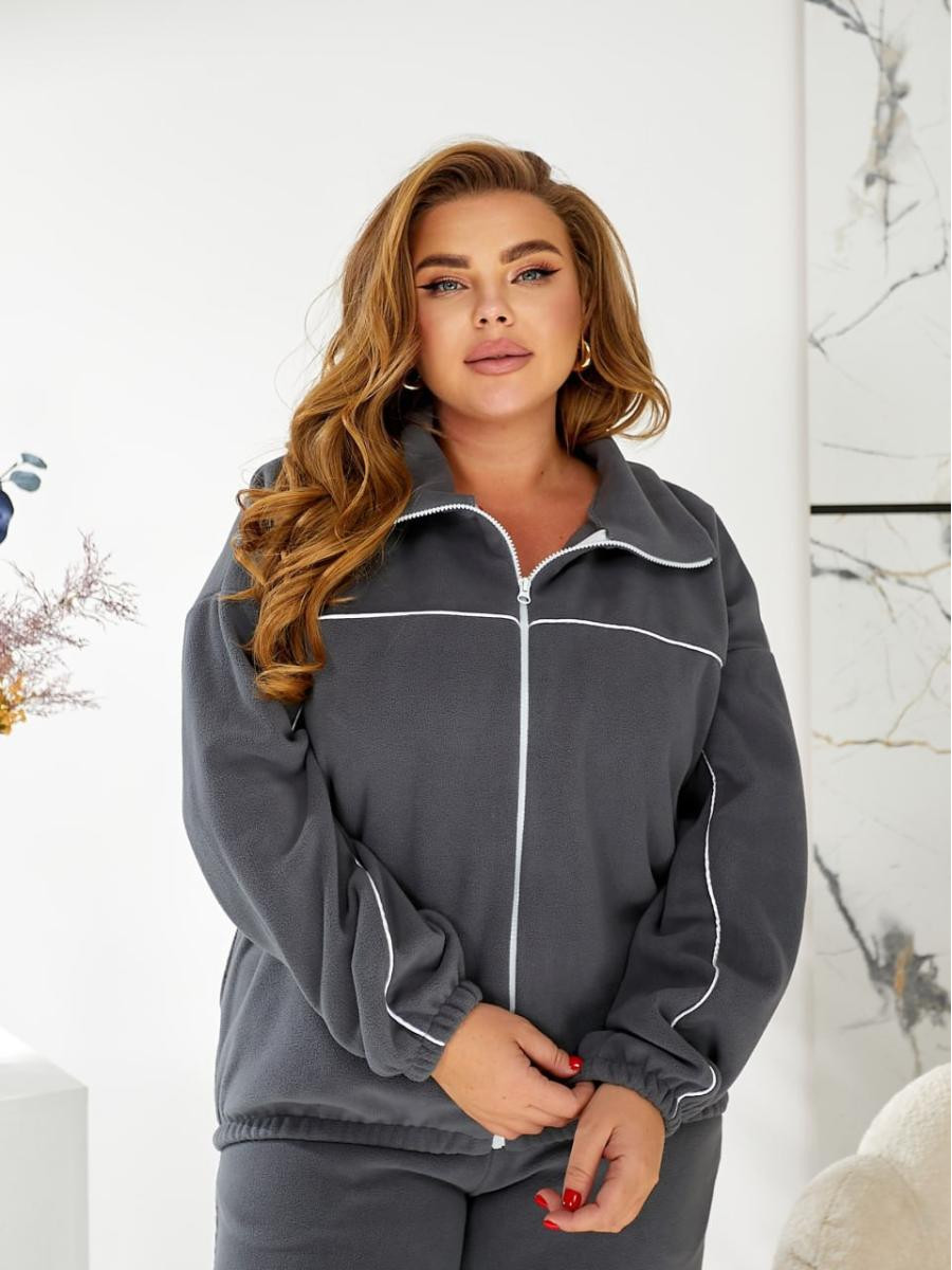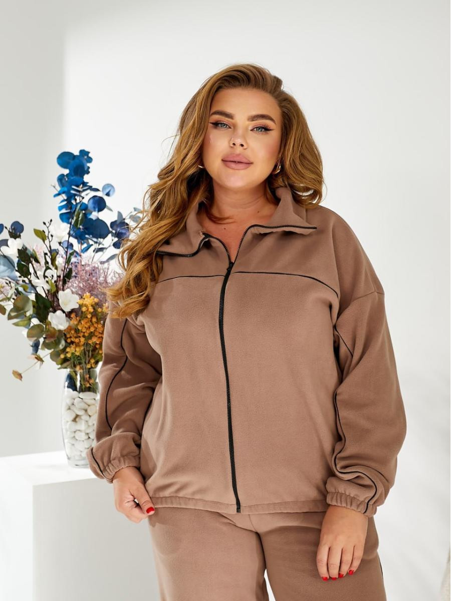 Спортивний костюм флисовий модель – 725-5425 ВИМІРИ модель 725-5425 42-44: Кофта: ОГ-122см, ОС-80-106см, довжина – 65см, рукав по внутр.шву — 48см Штани: ОТ-68-90см, ОС-96см довжина — 102см, по внутр.шву — 72см 46-48: Кофта: ОГ-128см, ОС-84-112см, довжина – 65см, рукав по внутр.шву — 48см Штани: ОТ-74-94см, ОС-102см довжина — 102см, по внутр.шву — 72см 50-52: Кофта: ОГ-136см, ОС-88-116см, довжина – 66см, рукав по внутр.шву — 48см Штани: ОТ-80-102, ОС-116см довжина — 102см, по внутр.шву — 72см 54-56: Кофта: ОГ-148см, ОС-100-124см, довжина – 67см, рукав по внутр.шву — 48см Штани: ОТ-86-106см, ОС-120см довжина — 104см, по внутр.шву — 74см Матеріал: турецький флис Розміри: 42-44, 46-48 — Розміри: 50-52, 54-56 — +50 Кольори: чорний, темно-сірий, мокко, молочний Кофта вільного крою, застібається на блискавку. Штани джогери, 2-і кишені. Кофта та штани оброблені кантом.