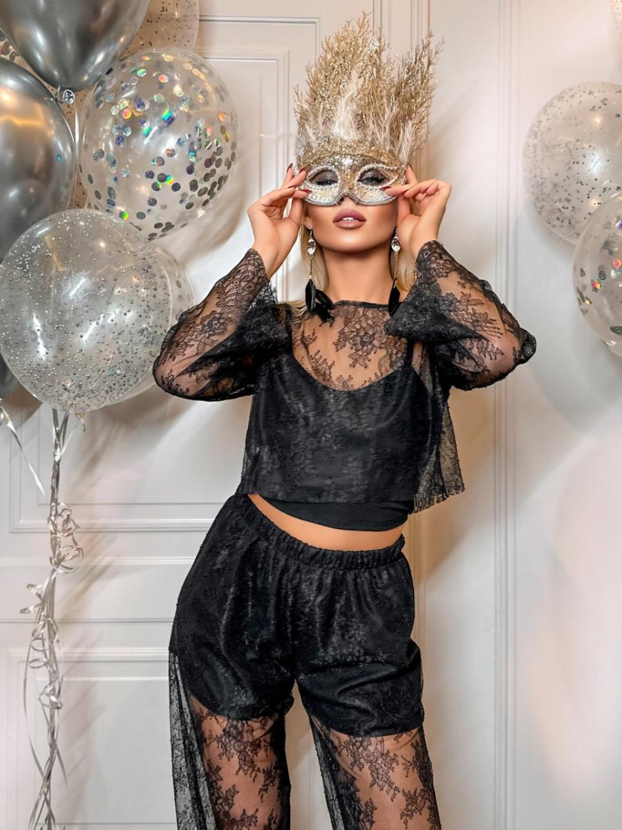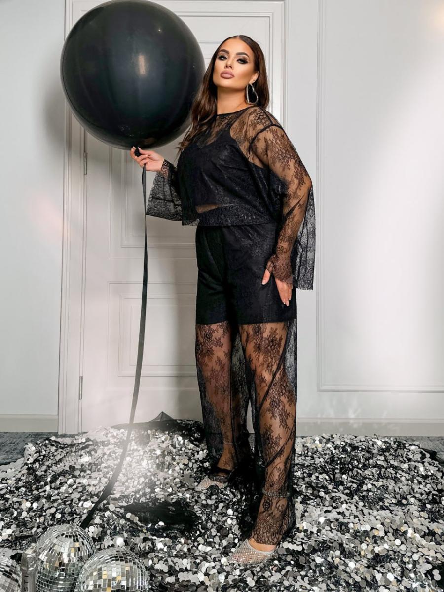 Матеріал: тонке французьке Мереживо. Підкладка: щільний, гарної розтяжності трикотаж. Довжина кофточки 51 см, знімний топ на бретелях. довжиною 42 см. Довжина штанів по зовнішньому шву 110 см, внутрішньому 77 см. Підкладка вшита. Пояс на резинці. 42-46: ОС 90-104 см, ОГ 78-96 см, ОТ 61-102 48-52- ОГ 98-108, ОС 104-116 см, ОТ 74-115
