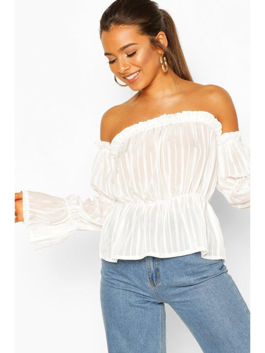 Білий топ у тонку атласну смужку з об’ємними рукавами і бардо